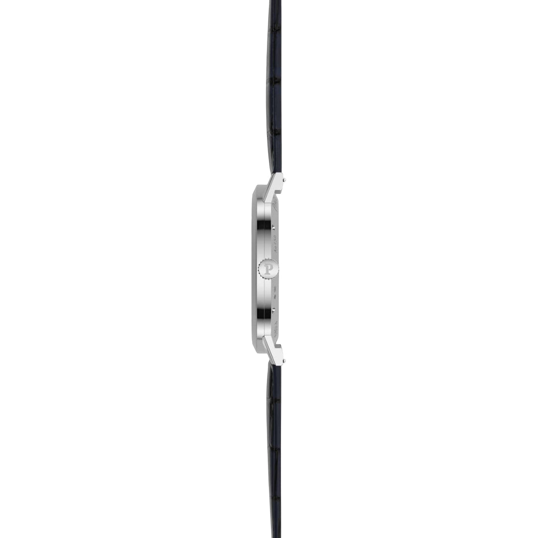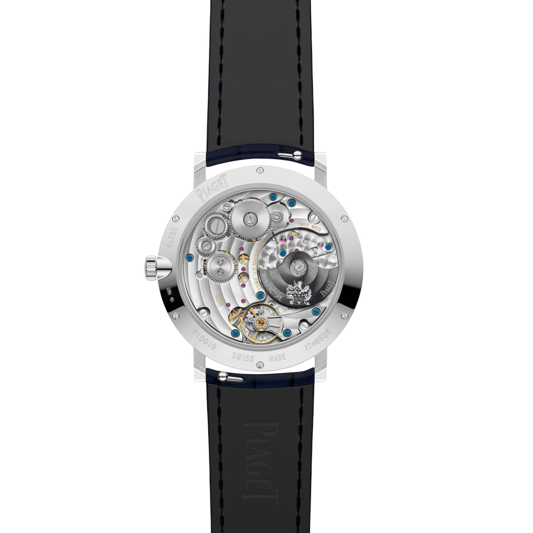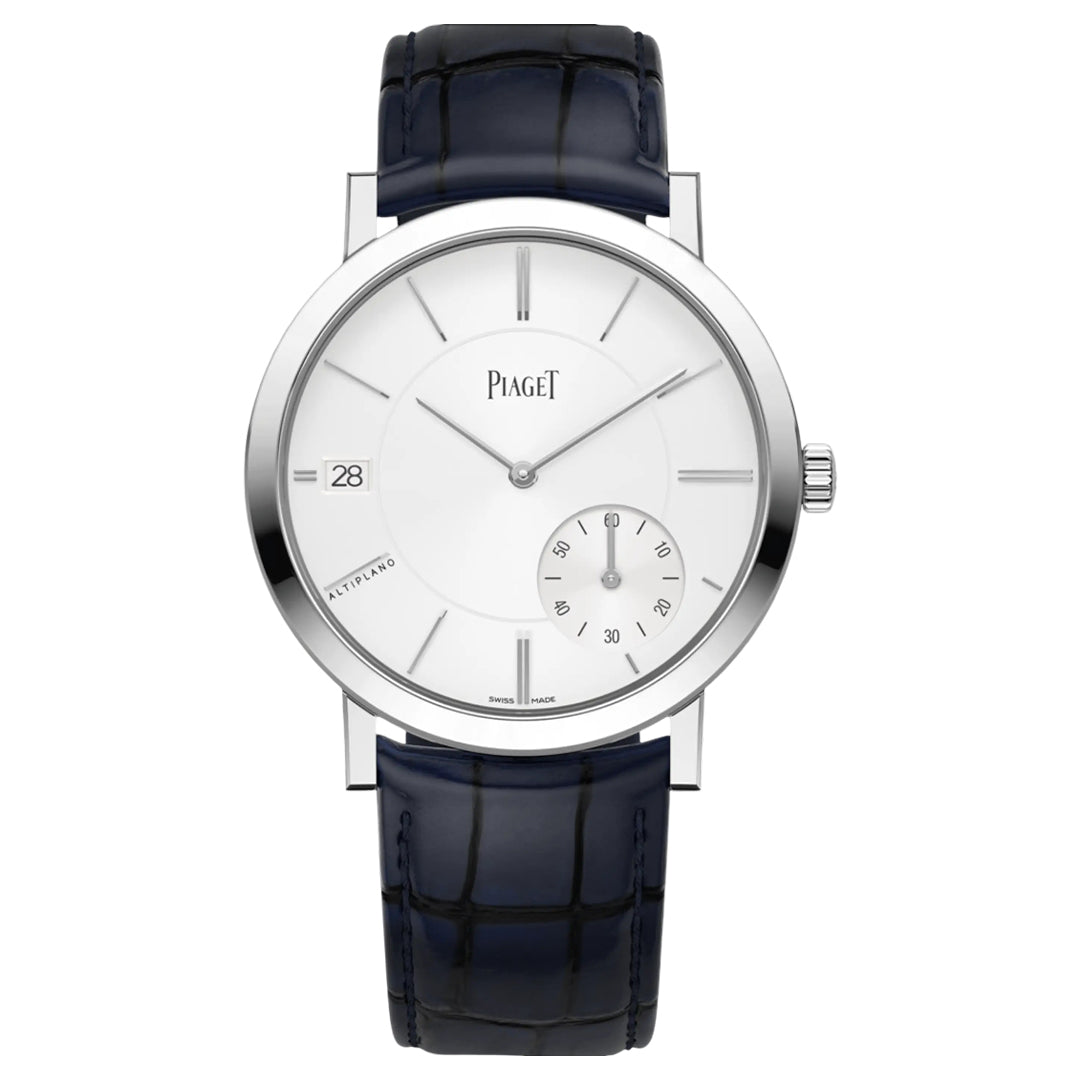 The piaget altiplano origin watch features a 40 mm 18k white gold case, a minimalist dial with rhodiumed gold hour markers, and an ultra-thin self-winding mechanical movement with small seconds and date, paired with an interchangeable strap.