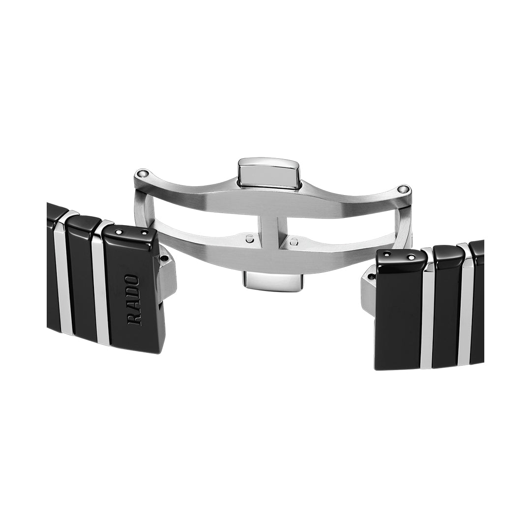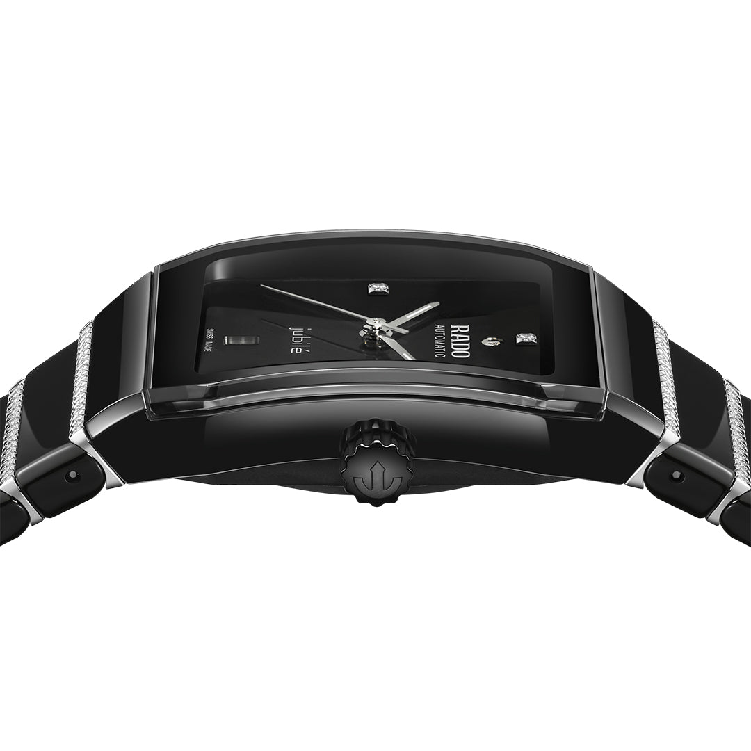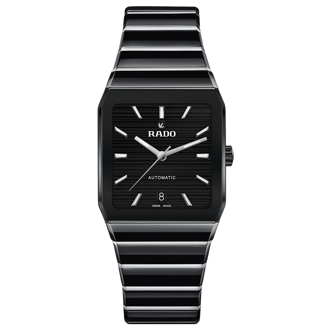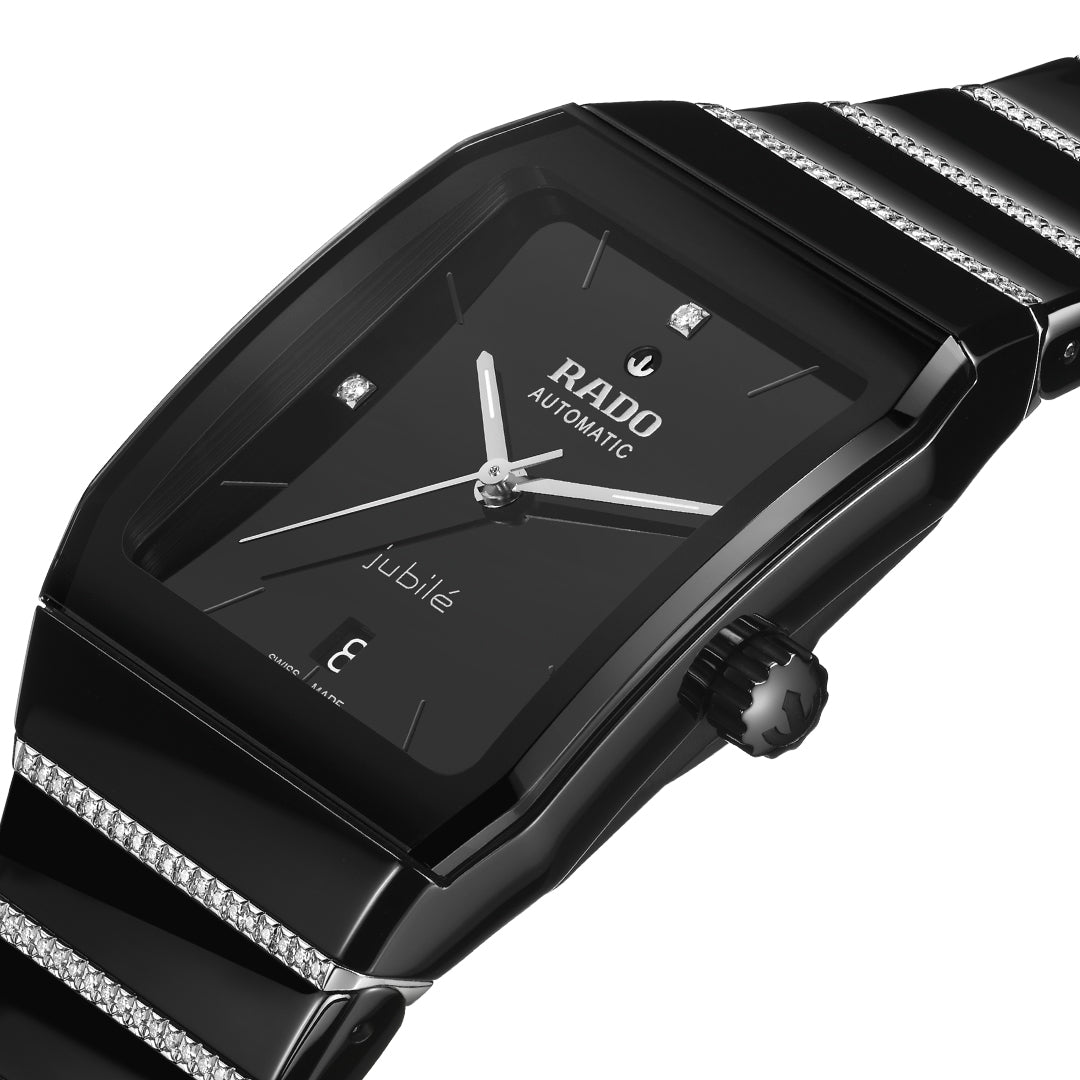 The Rado anatom r10201409 embodies elegance and innovation with its cylindrical sapphire crystal and diamond-set ceramic and steel bracelet. A black lacquered dial with diamond indexes and super-luminova® hands enhances its refined design. Powered by the automatic r766 calibre, it offers precision and a 72-hour power reserve.