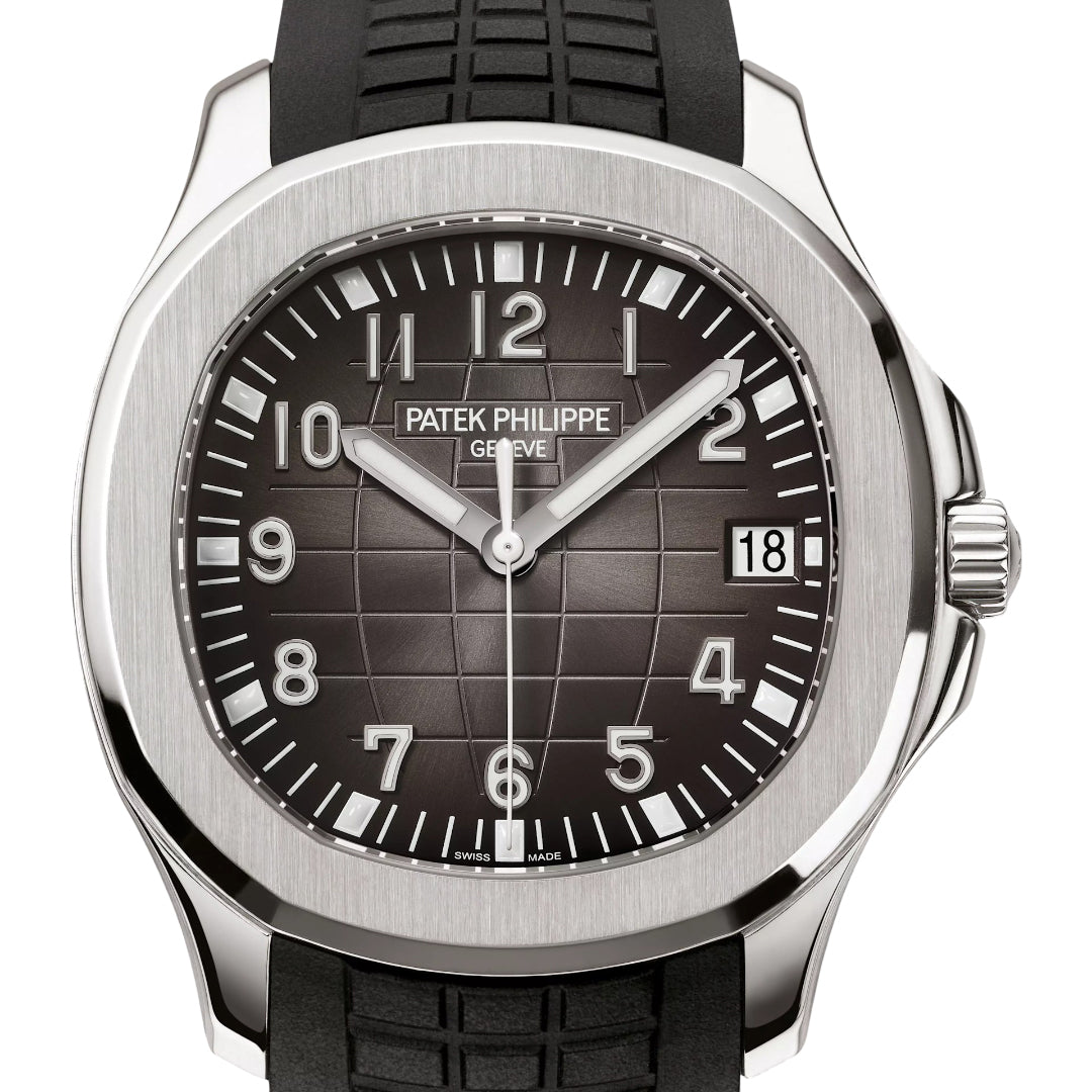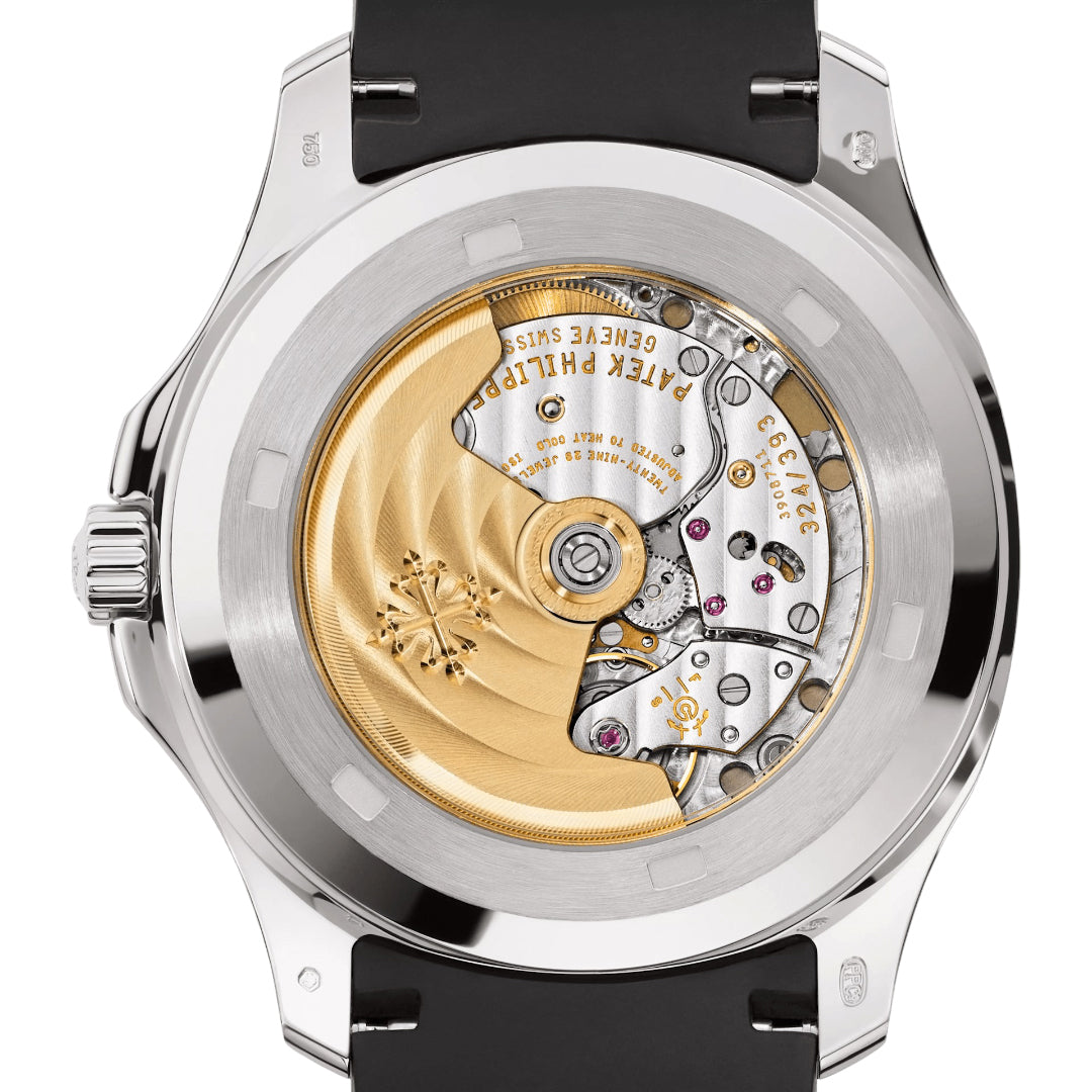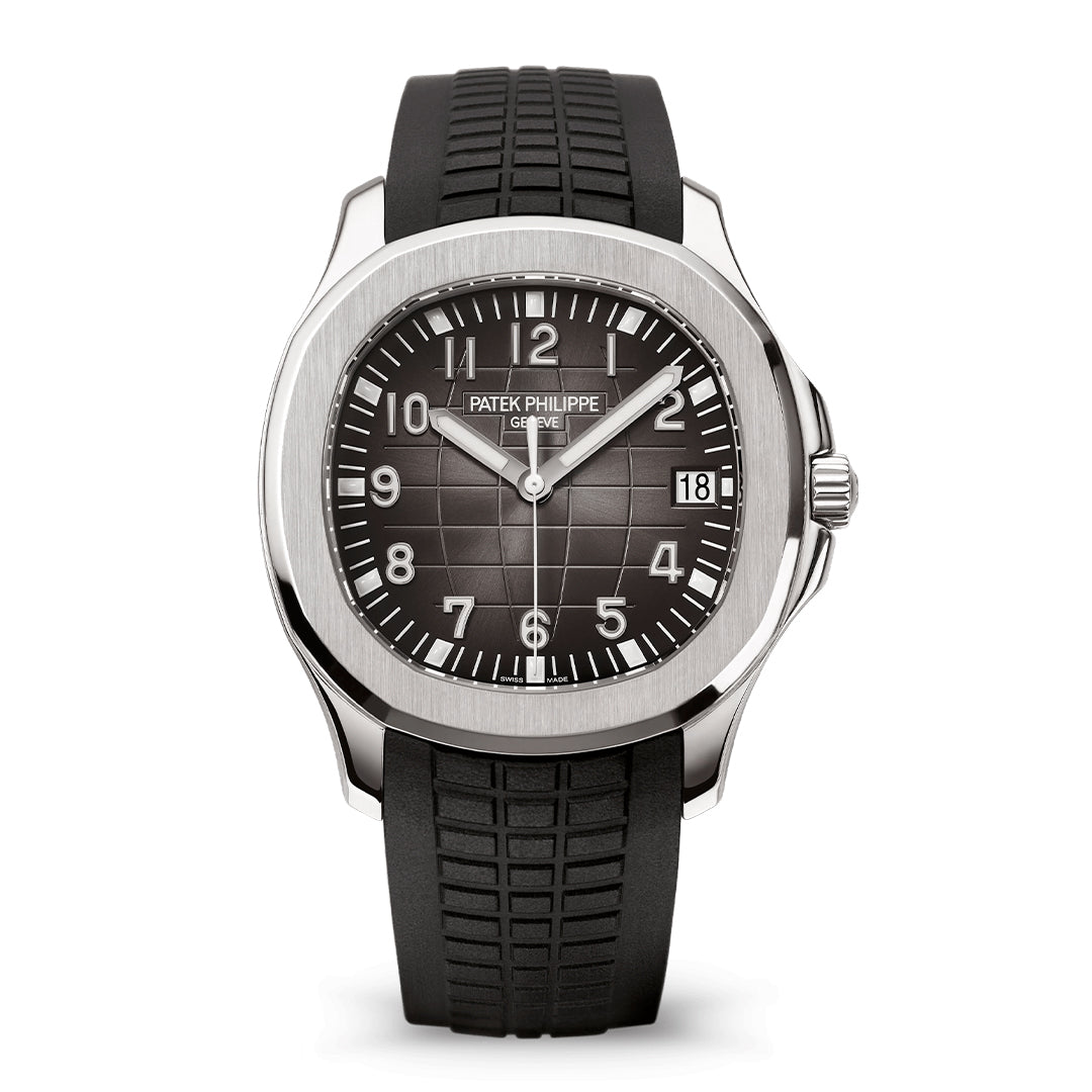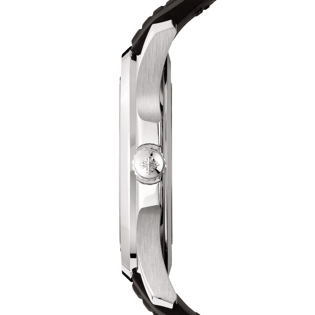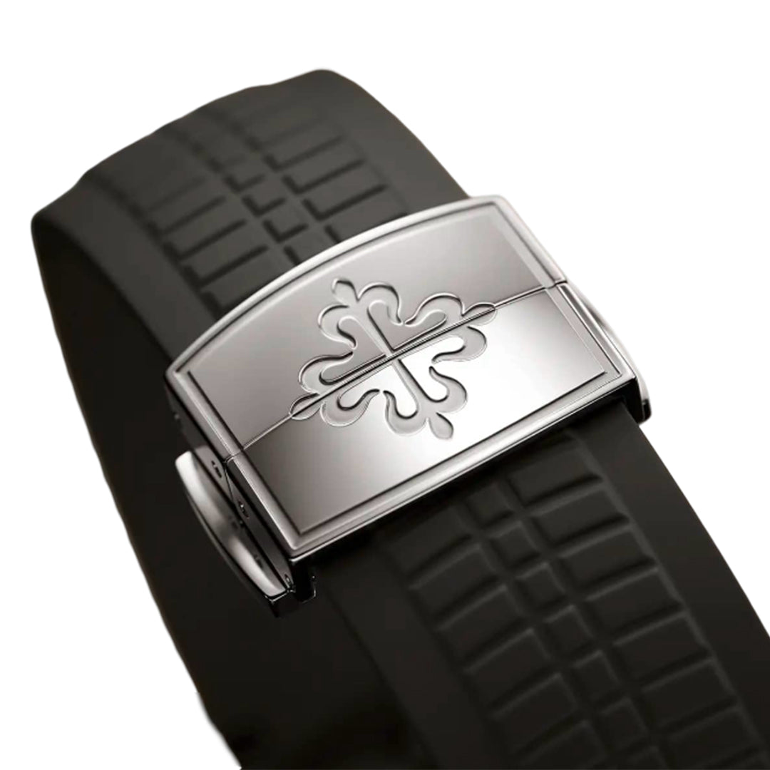 The Patek Philippe aquanaut 5167a-001 pairs a 40.8 mm stainless steel case with a charcoal gray embossed dial and luminescent white-gold numerals. Its self-winding caliber 26-330 s c offers date display, sweep seconds, and a 45-hour power reserve. Finished with a black composite strap, steel fold-over clasp, and sapphire case back, it balances sportiness with elegance.