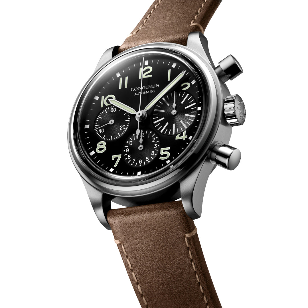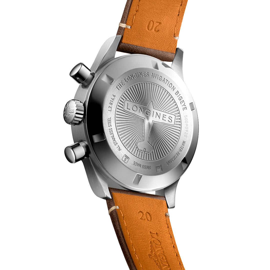 The longines avigation bigeye is a 41 mm automatic chronograph in stainless steel. It features a black dial with swiss super-luminova® for enhanced readability, a self-winding movement beating at 28,800 vibrations per hour with a 66-hour power reserve, and a leather strap with buckle. The watch has 3 bar (30 m) water resistance and a scratch-resistant sapphire crystal with anti-reflective coating. Inspired by early 20th-century pilot watches, it reflects longines’ deep heritage in aviation and precision timekeeping.