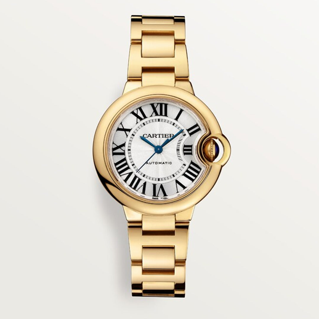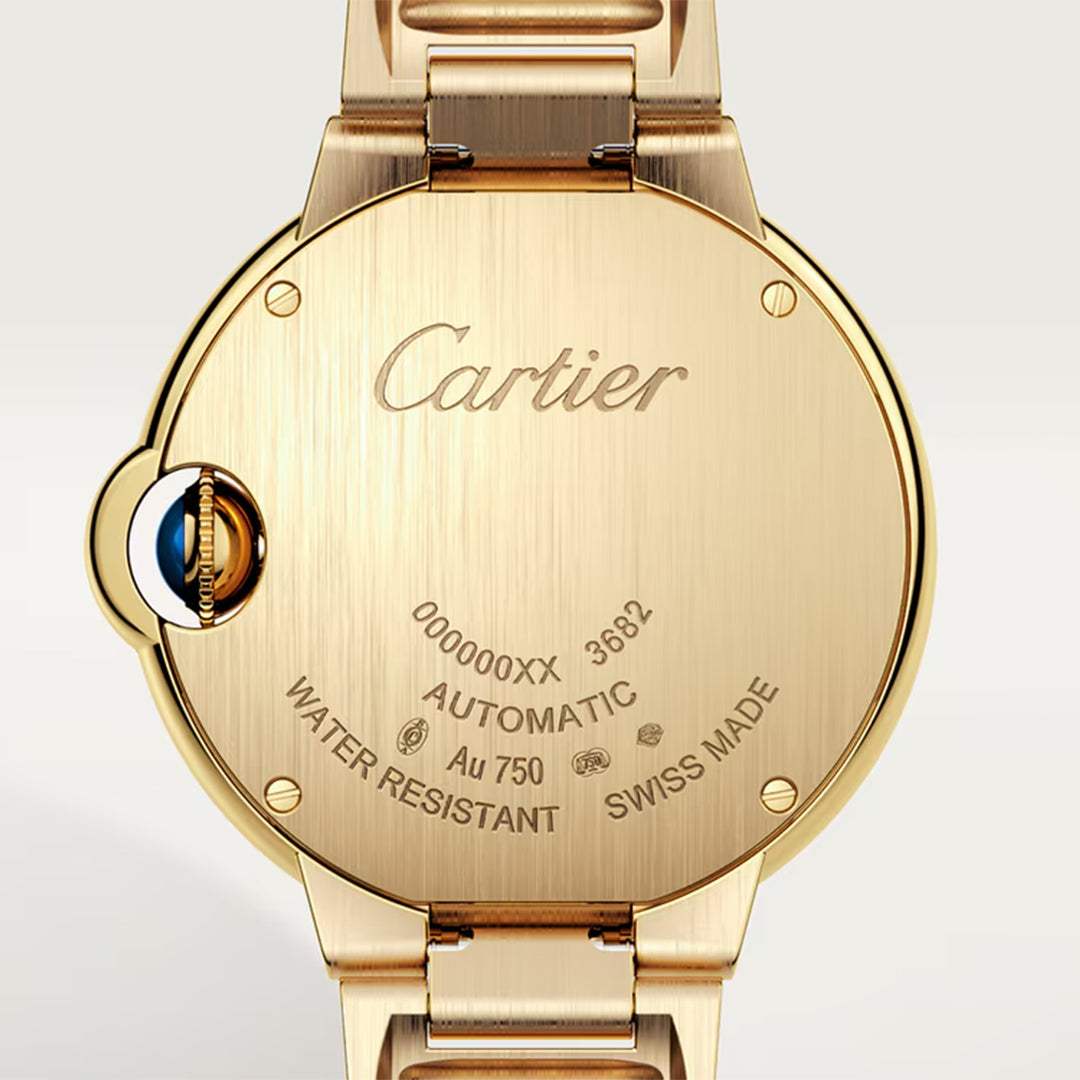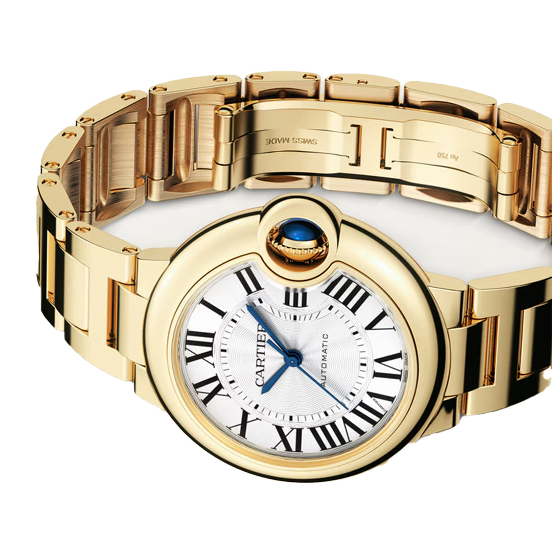The cartier ballon bleu 33 mm showcases a yellow gold case with sapphire cabochon crown, silver guilloché dial, and blued-steel sword hands. Powered by an automatic movement, it comes with an interchangeable yellow gold bracelet.