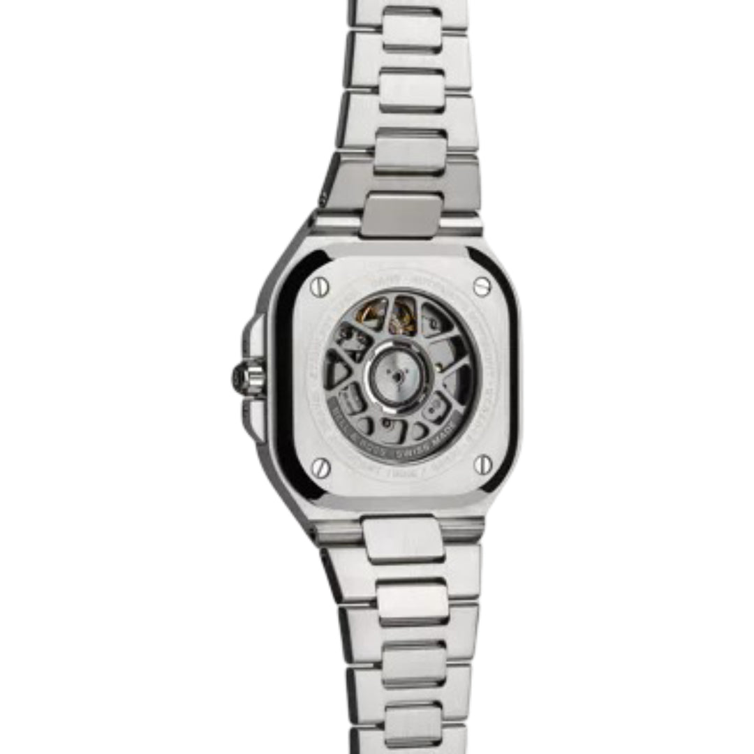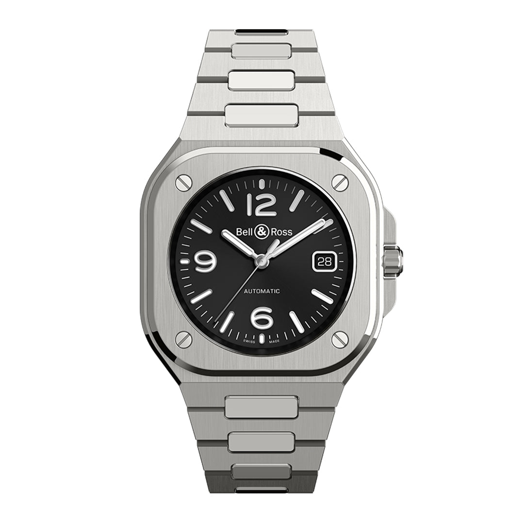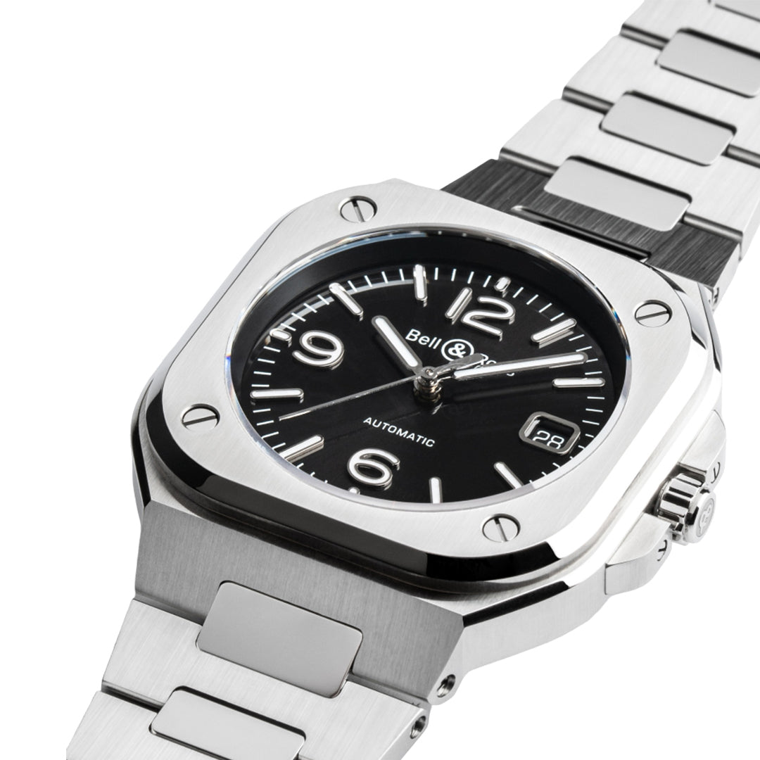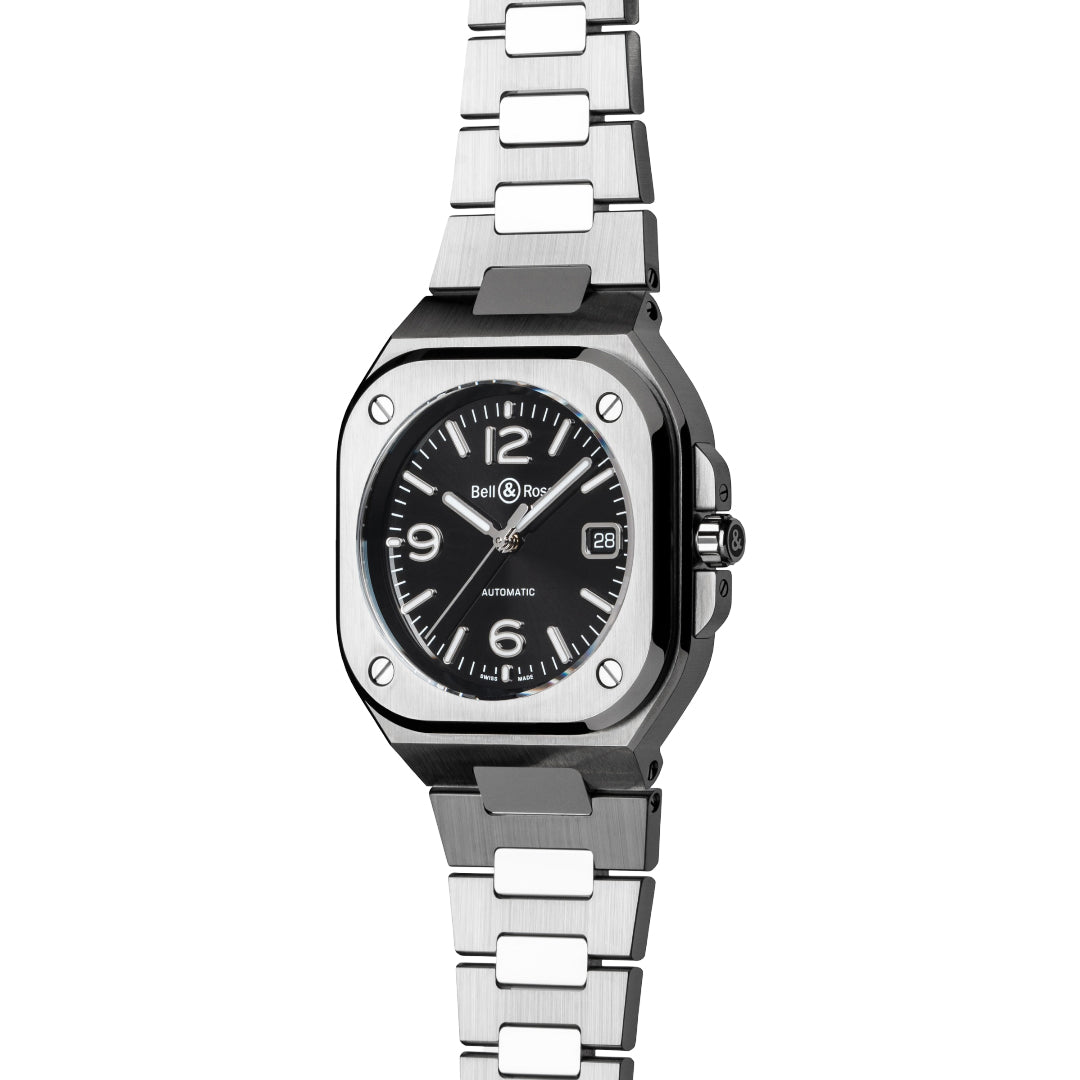 The Bell & Ross BR 05 Black Steel features a 40 mm satin-polished steel case with integrated bracelet design for a sleek, unified look. Its black sunray dial with Super-LumiNova® indices ensures readability in all conditions. Powered by the automatic BR-CAL.321 movement, it offers hours, minutes, seconds, and date functions. With 100-meter water resistance and a sapphire case back, it combines strength and elegance for urban lifestyles.