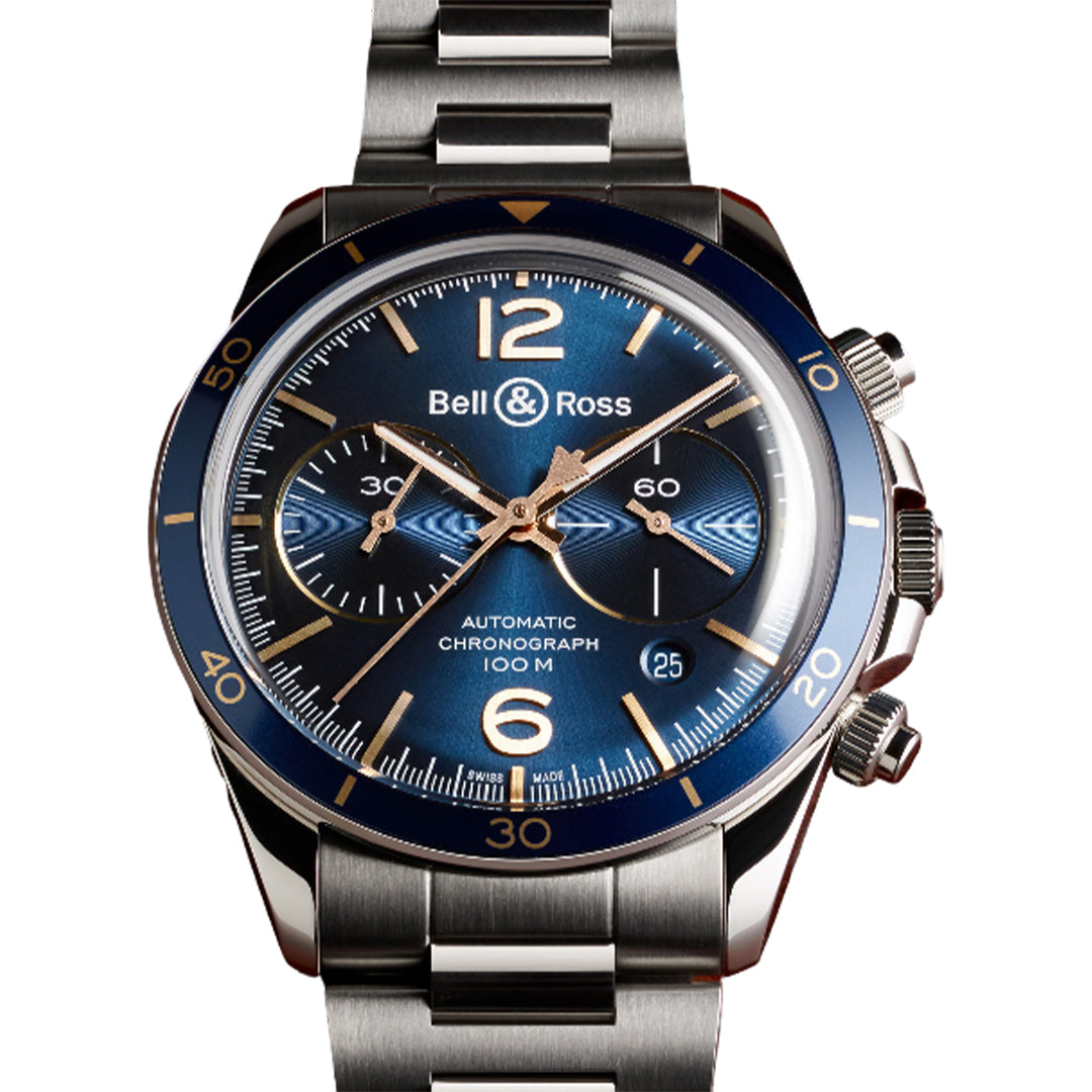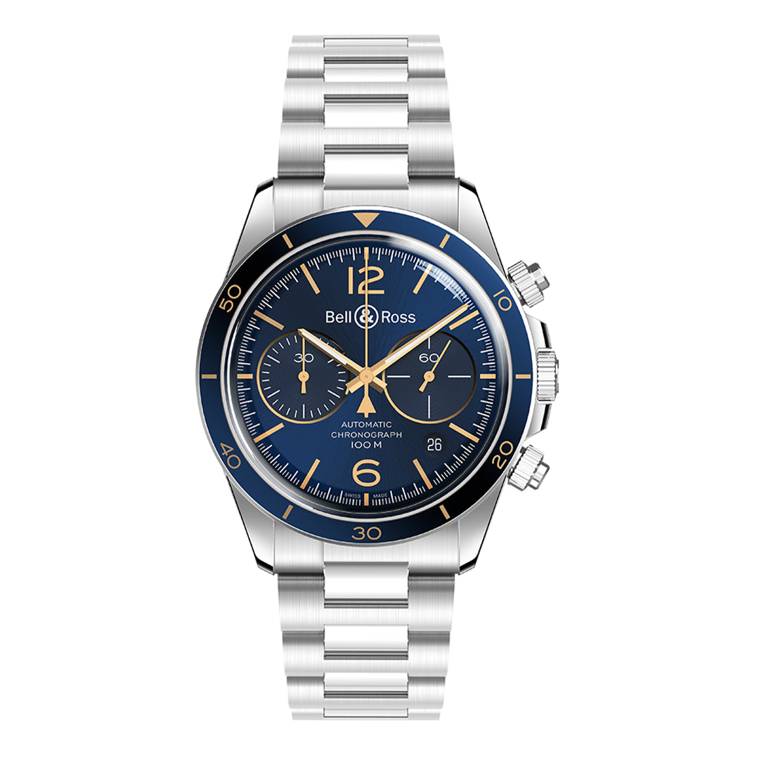 The bell & ross br v2-94 aeronaval blends elegance and functionality with a 41 mm polished steel case and navy blue sunray dial. Gilt skeletonized hands and indices enhance legibility, while the ultra-curved sapphire crystal adds vintage flair. Powered by the automatic br-cal.301 chronograph movement, it offers precision and reliability. With 100 m water resistance and a choice of blue calfskin or steel strap, it embodies refined military-inspired style.