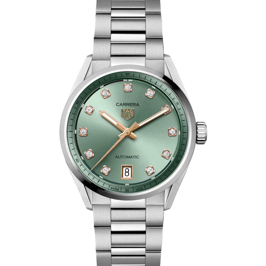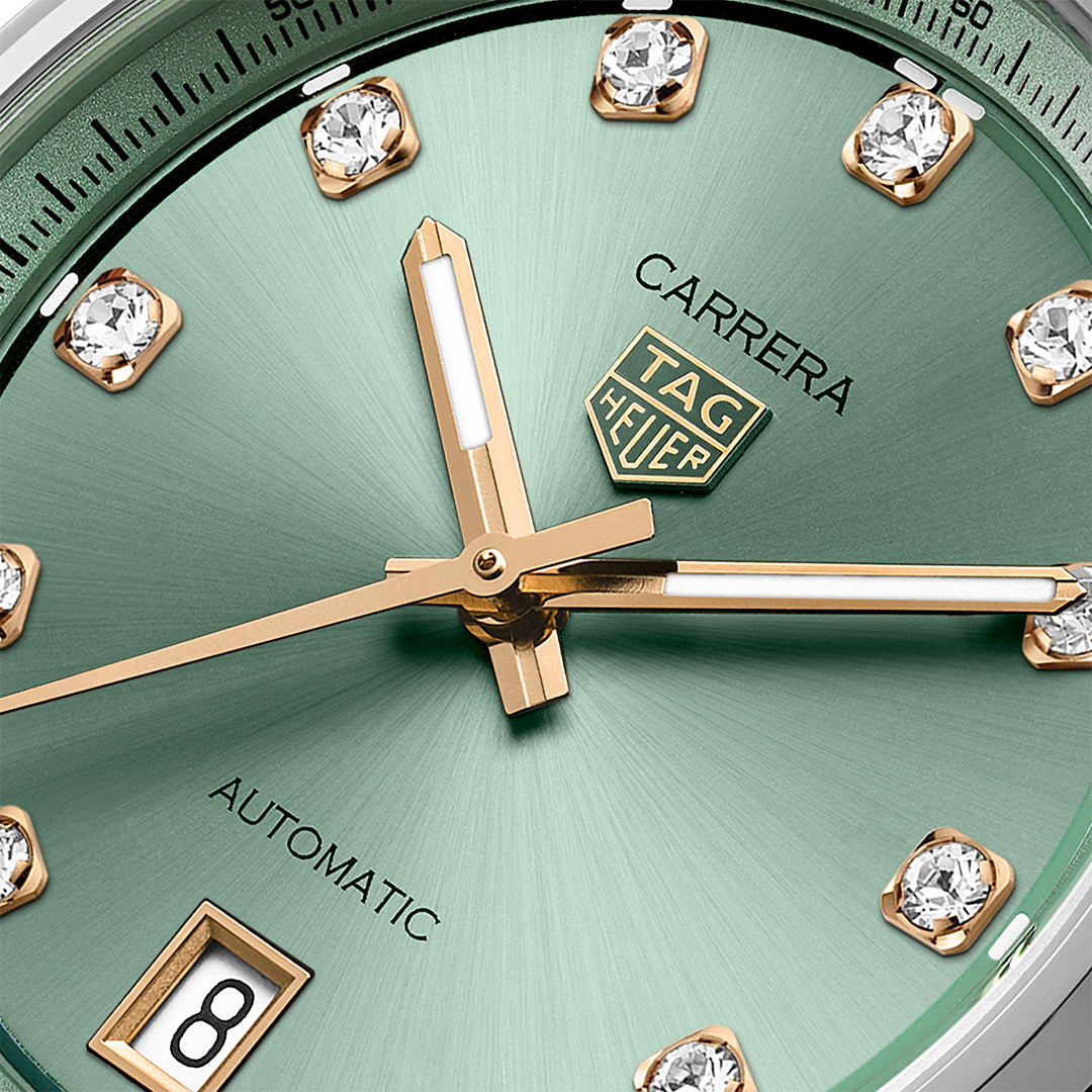The tag heuer carrera date is a 36 mm automatic watch in stainless steel with a green sunray-brushed dial. It features 11 vs diamonds (0.22 ct) as hour markers set in 18k 5n rose gold-plated chatons, with facetted hour and minute hands coated in white superluminova® for low-light readability. The steel case is finely brushed and polished, offering water resistance up to 50 meters. This timepiece blends refined elegance with practical durability, making it suitable for both everyday wear and special occasions.