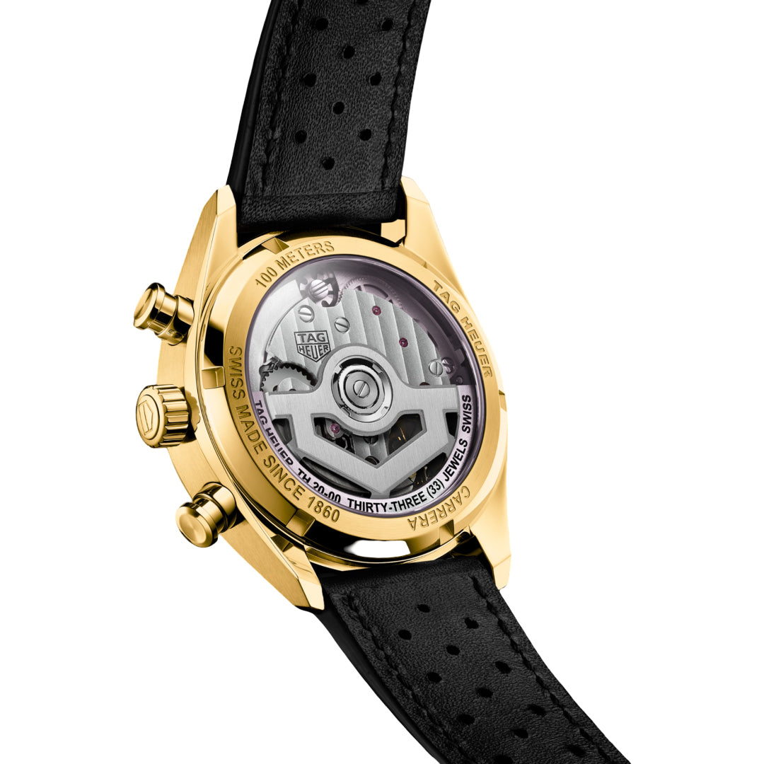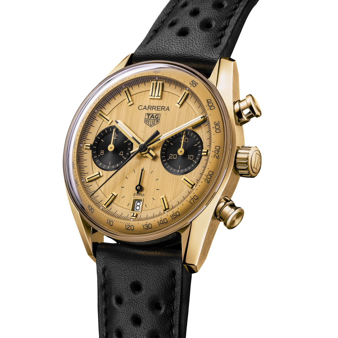 The tag heuer carrera chronograph is a 39 mm automatic watch crafted in 18k 3n solid gold. Its iconic “panda” style black sub-dials contrast strikingly against the yellow-gold vertical-brushed dial, blending heritage with luxury. The domed sapphire crystal enhances legibility, while the perforated black calfskin strap with a polished gold buckle completes the elegant and sporty design.