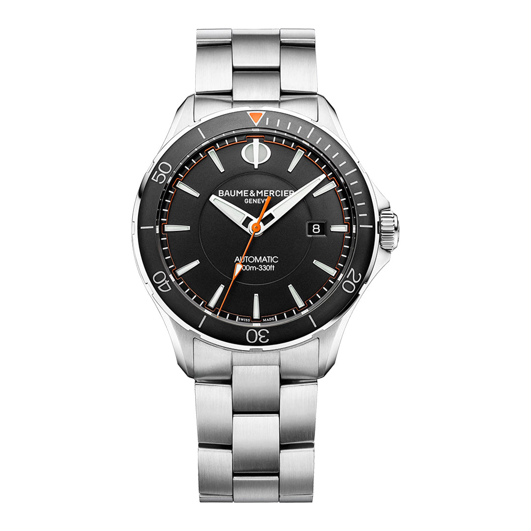The clifton club is a 42 mm stainless steel automatic watch with a black opaline dial, date display, super-luminova hands and indexes, and a polished 3-row steel bracelet.
