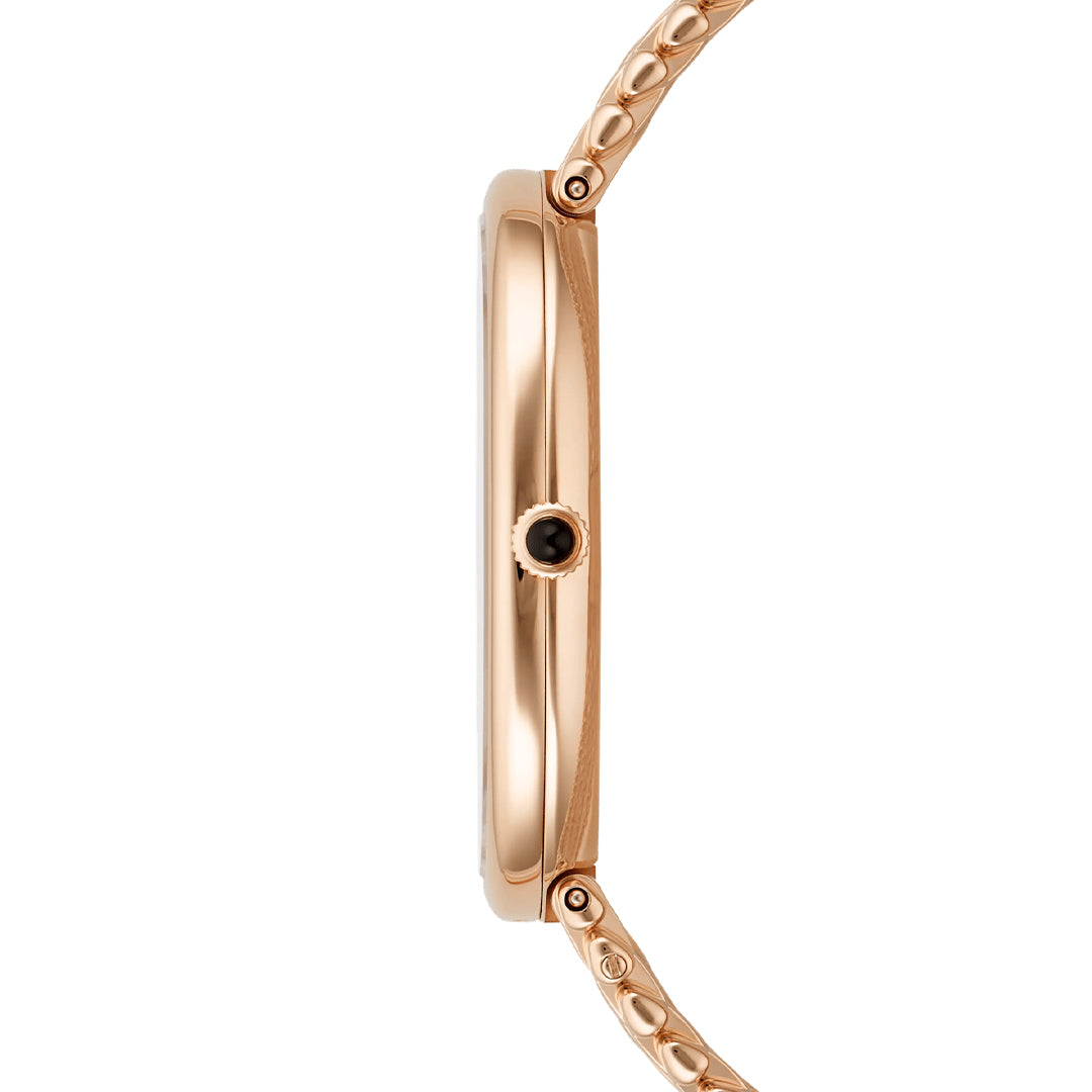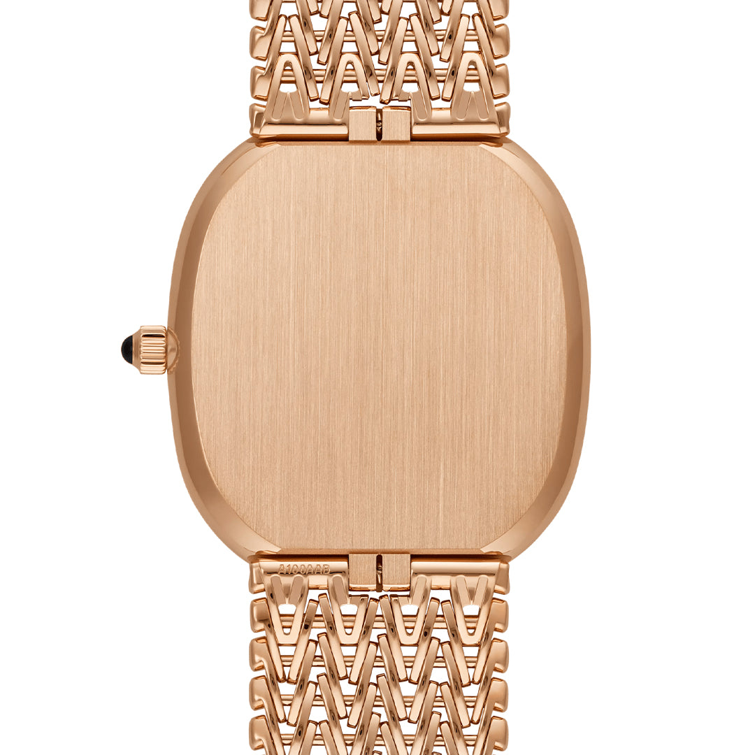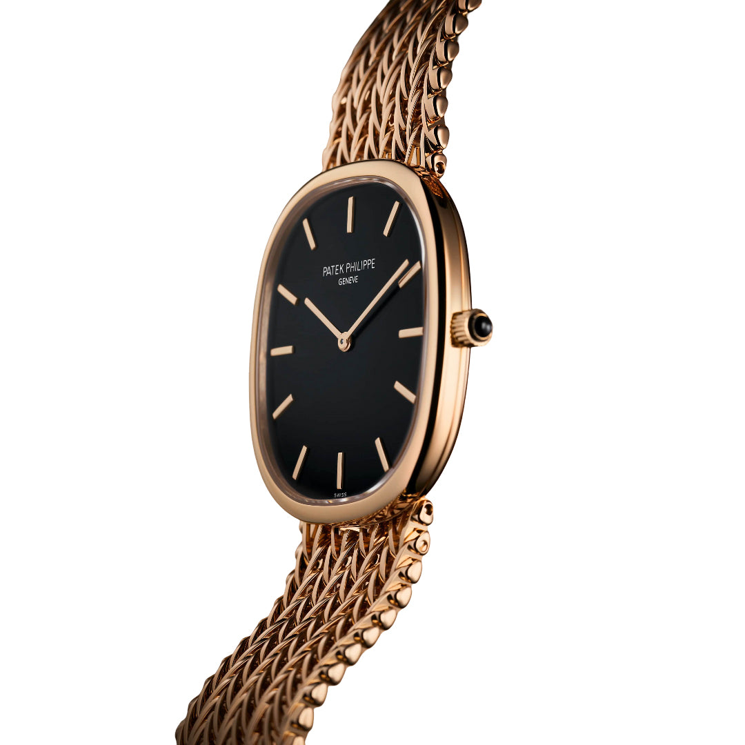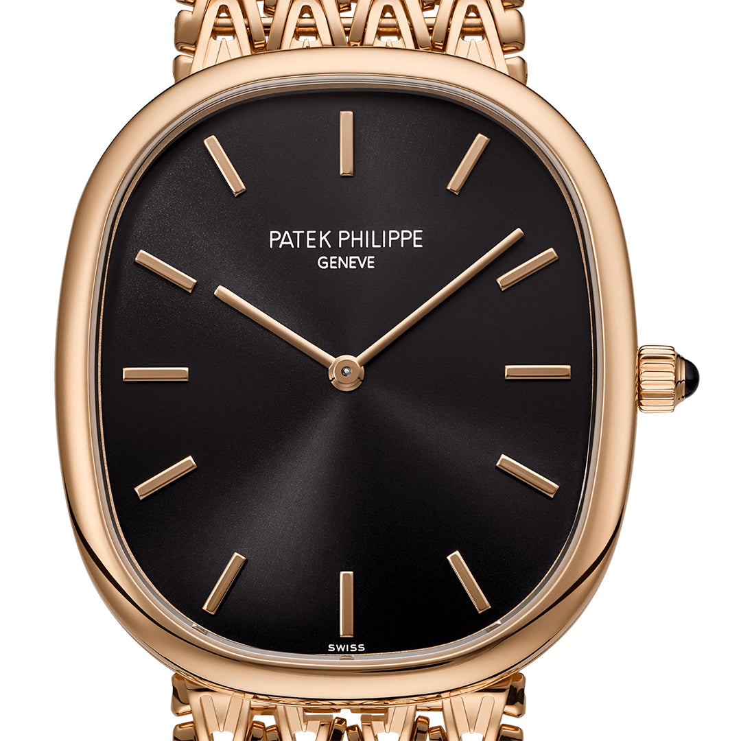The Patek Philippe Golden Ellipse 5738/1R-001 embodies pure elegance with its iconic elliptical rose gold case measuring 34.5 × 39.5 mm and just 5.9 mm thick. Its sunburst ebony black dial, framed by rose gold baton markers and cheveu-style hands, rests on an 18K gold plate for timeless refinement. Powered by the ultra-thin self-winding Caliber 240 with a 22K gold off-center micro-rotor and 48-hour power reserve, this masterpiece pairs artistry with technical sophistication, completed by a matching rose gold bracelet with engraved adjustable clasp.
