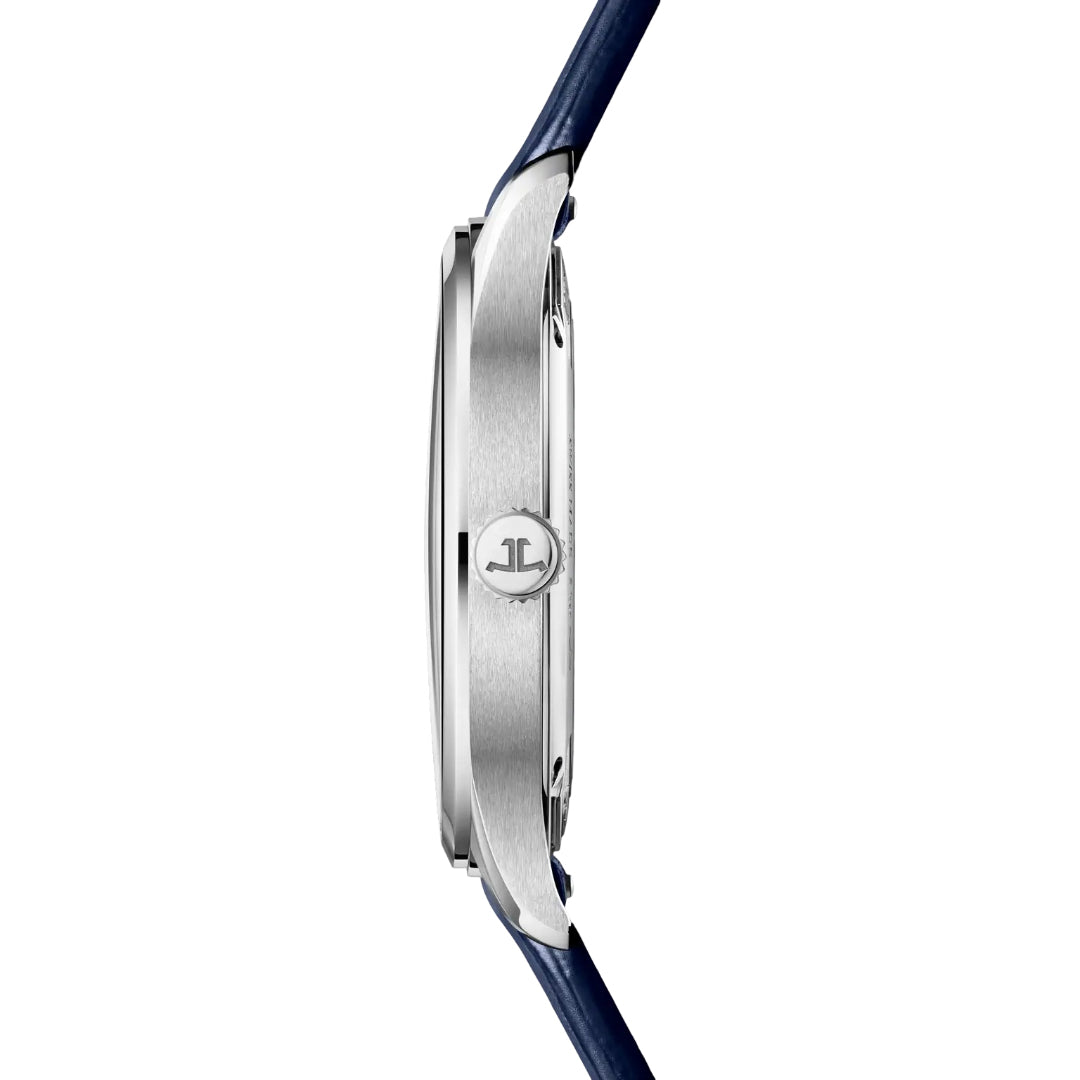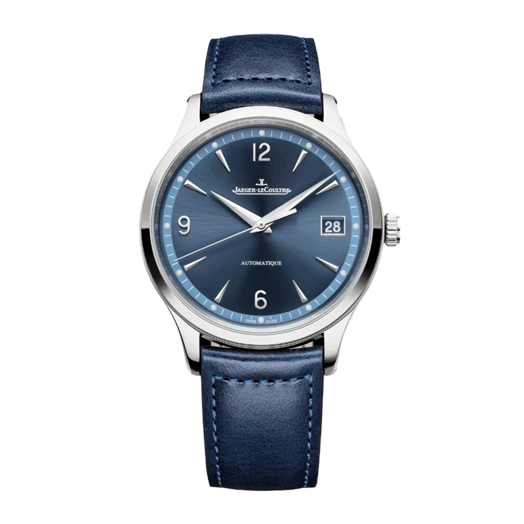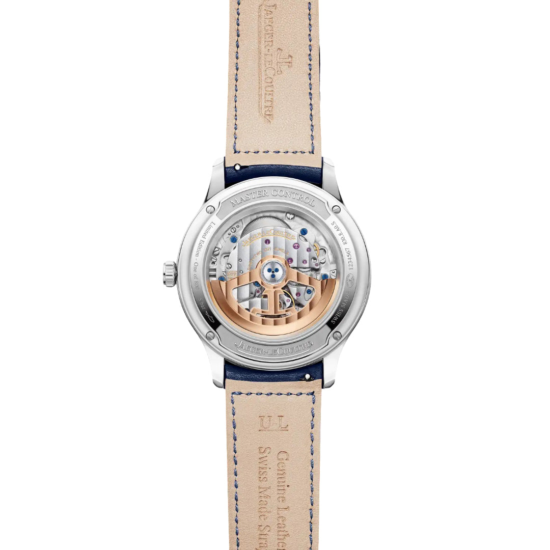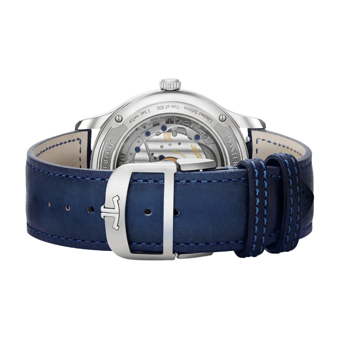 The jaeger-lecoultre master control date features a 40 mm stainless steel case with a two-tone blue sunray-brushed dial and date at 3 o’clock. Limited to 800 pieces, it is powered by the calibre 899 with a 70-hour power reserve, visible through its sapphire case back.