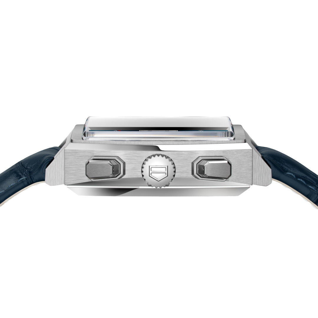 The tag heuer monaco chronograph is a 39 mm automatic watch in stainless steel, powered by the in-house th20-00 movement with an 80-hour power reserve. It features a square, metallic sunburst blue dial with two subdials, silver-toned markers, and a red central seconds hand. The angled date display at 6 o’clock and domed crystal highlight the vintage-inspired design. Finished with a blue alligator racing strap, this watch pays homage to the iconic monaco worn by steve mcqueen while delivering modern performance and style.