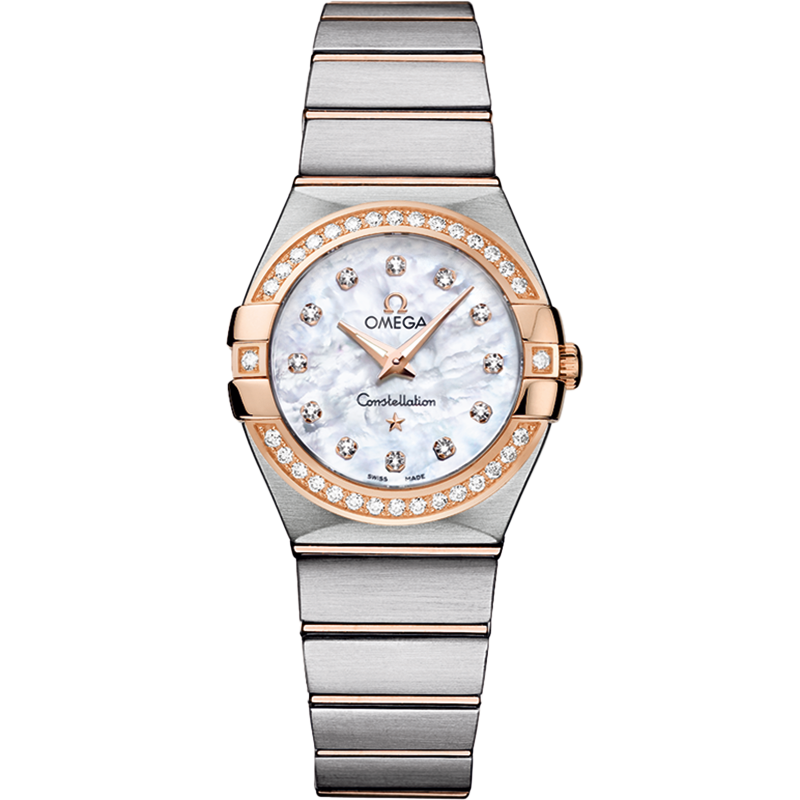 - It features a 27mm stainless steel case with a dazzling diamond-set 18K red gold bezel and a radiant white mother-of-pearl dial adorned with diamond indexes.