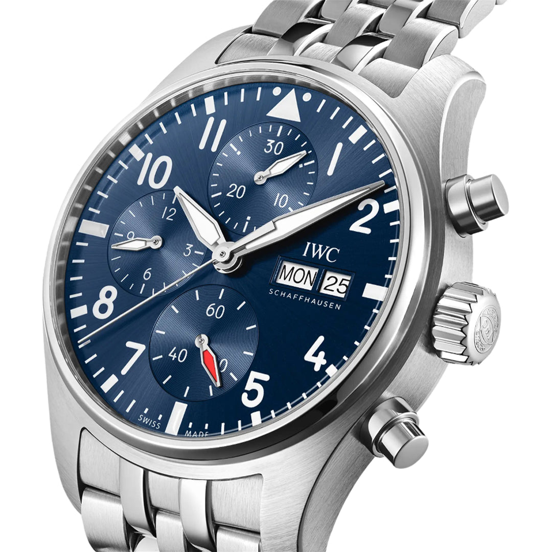 The iwc pilot’s watch chronograph 41 pairs sporty elegance with functionality, featuring a 41mm stainless steel case, blue dial, and easx-change® bracelet system. Powered by an iwc-manufactured automatic movement, it offers chronograph, day-date display, and 10 bar water resistance.