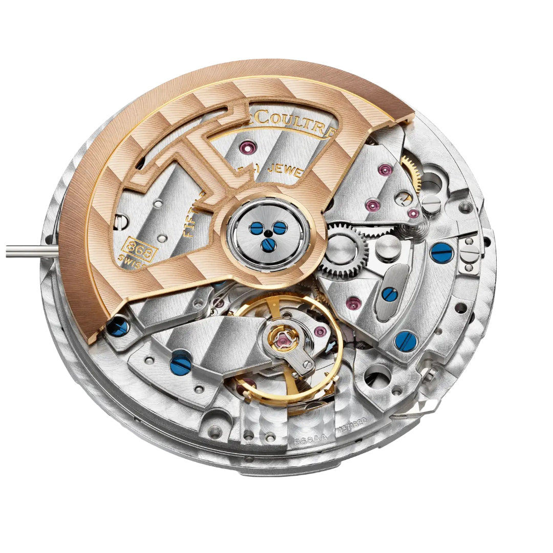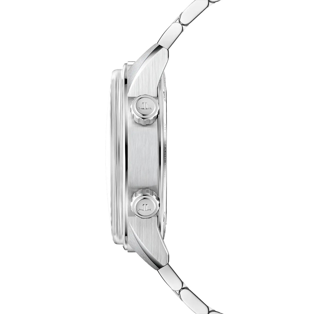 The jaeger-lecoultre polaris perpetual calendar comes in a 42 mm stainless steel case with a blue lacquered dial featuring four subdials and moon phase, requiring no correction until 2100. Powered by an automatic movement, it includes interchangeable steel and rubber straps for versatility.