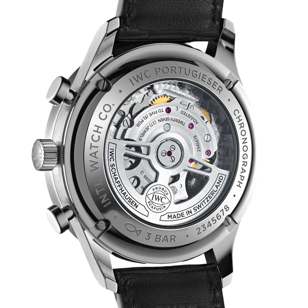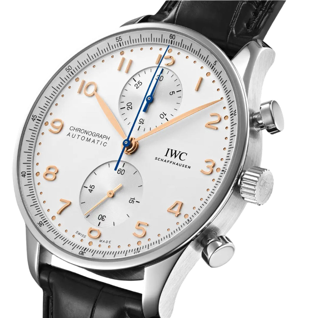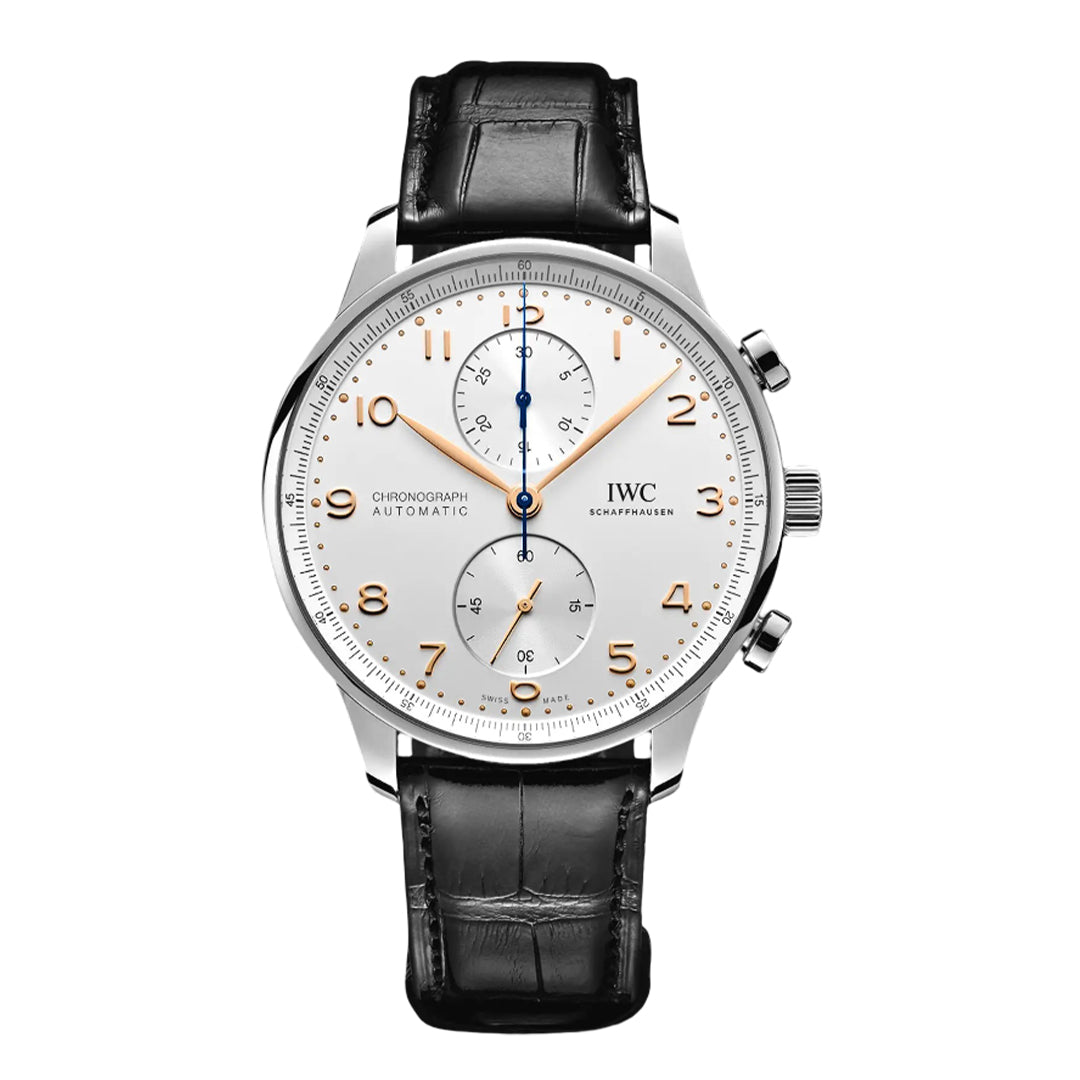 The iwc portugieser chronograph (41mm) is a timeless classic with a silver-plated dial, stainless steel case, and black alligator leather strap. Powered by the iwc calibre 69355, it offers chronograph functionality, a 46-hour power reserve, and sapphire glass with antireflective coating.
