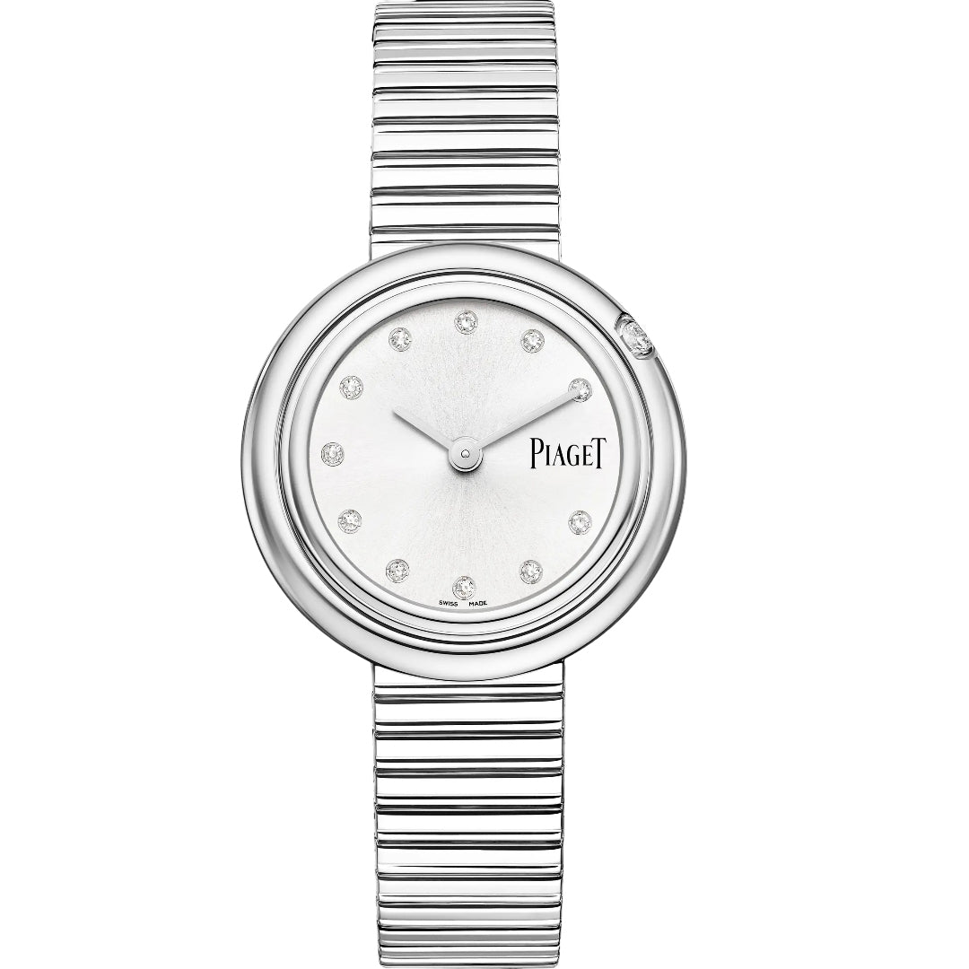 The possession watch features a 29 mm steel case set with a brilliant-cut diamond, a silver dial with 11 brilliant-cut diamonds, an interchangeable strap, and is powered by the piaget 358p quartz movement.