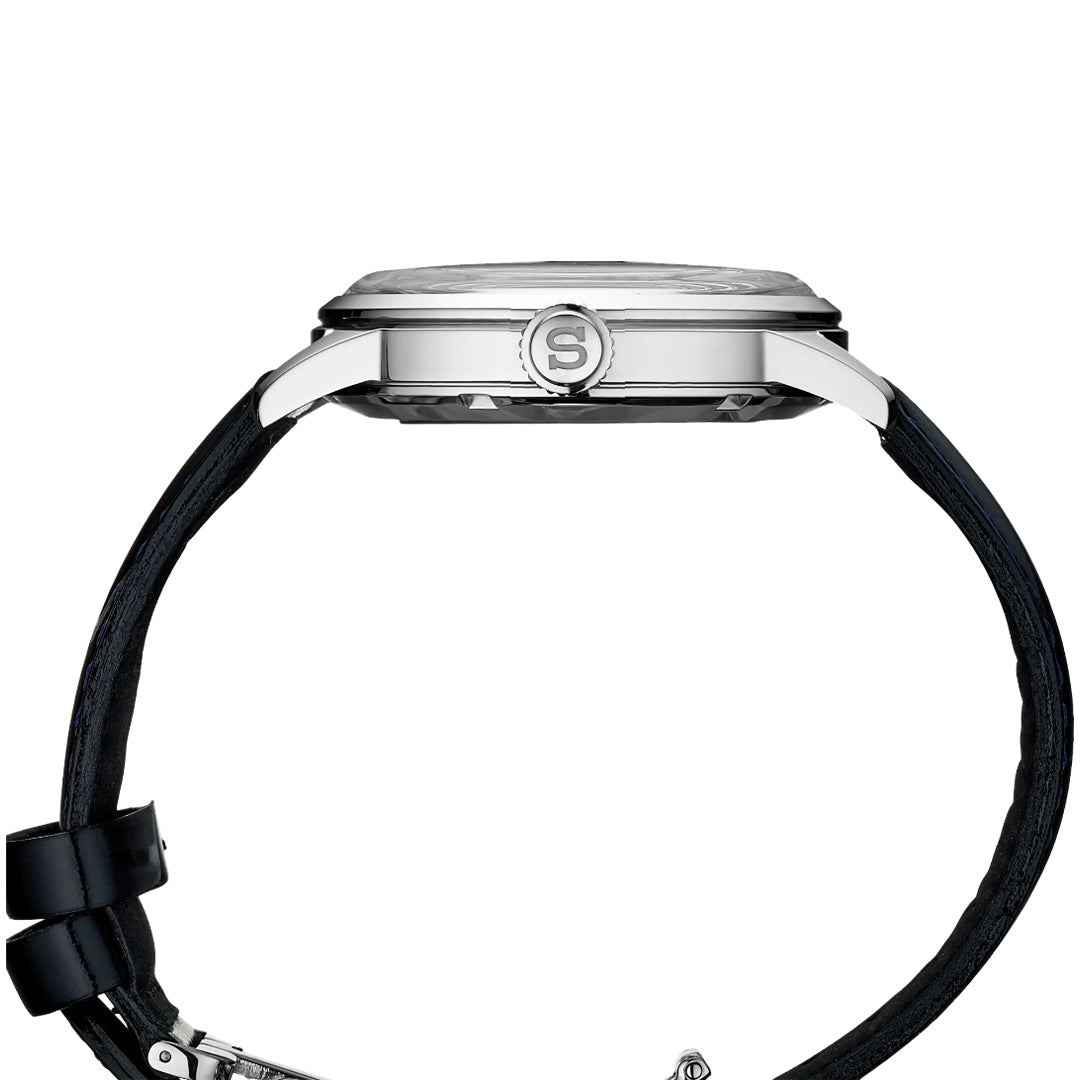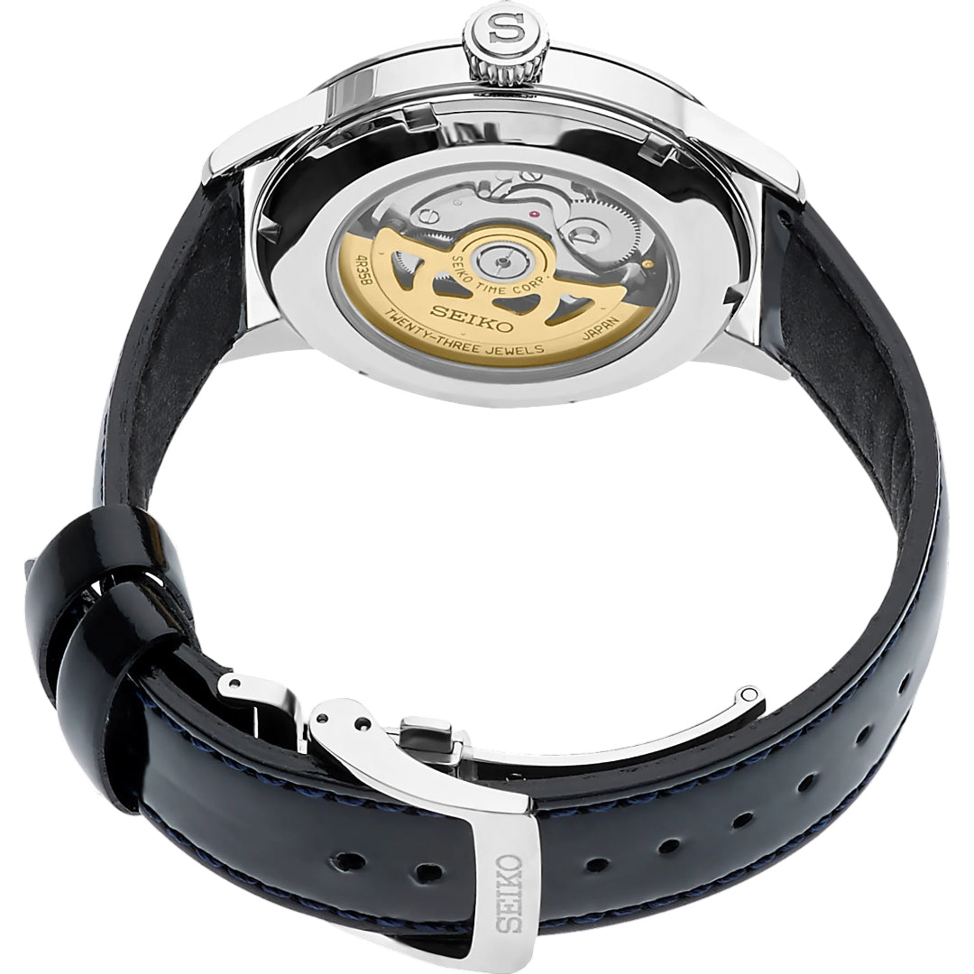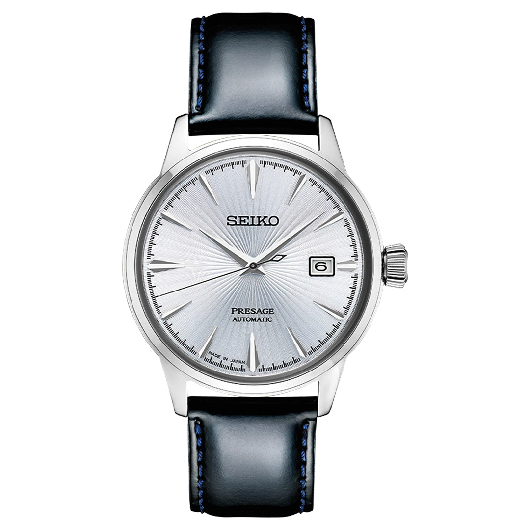 The Seiko presage cocktail time srpb43 showcases refined elegance with its pressed pattern dial, layered gloss finish, and curved hands crafted for a slim profile. Powered by an automatic movement with 41-hour reserve and 23 jewels, it offers both manual and self-winding options. Completed with a stainless-steel case, black leather strap, and 50m water resistance, it blends tradition with sophistication.