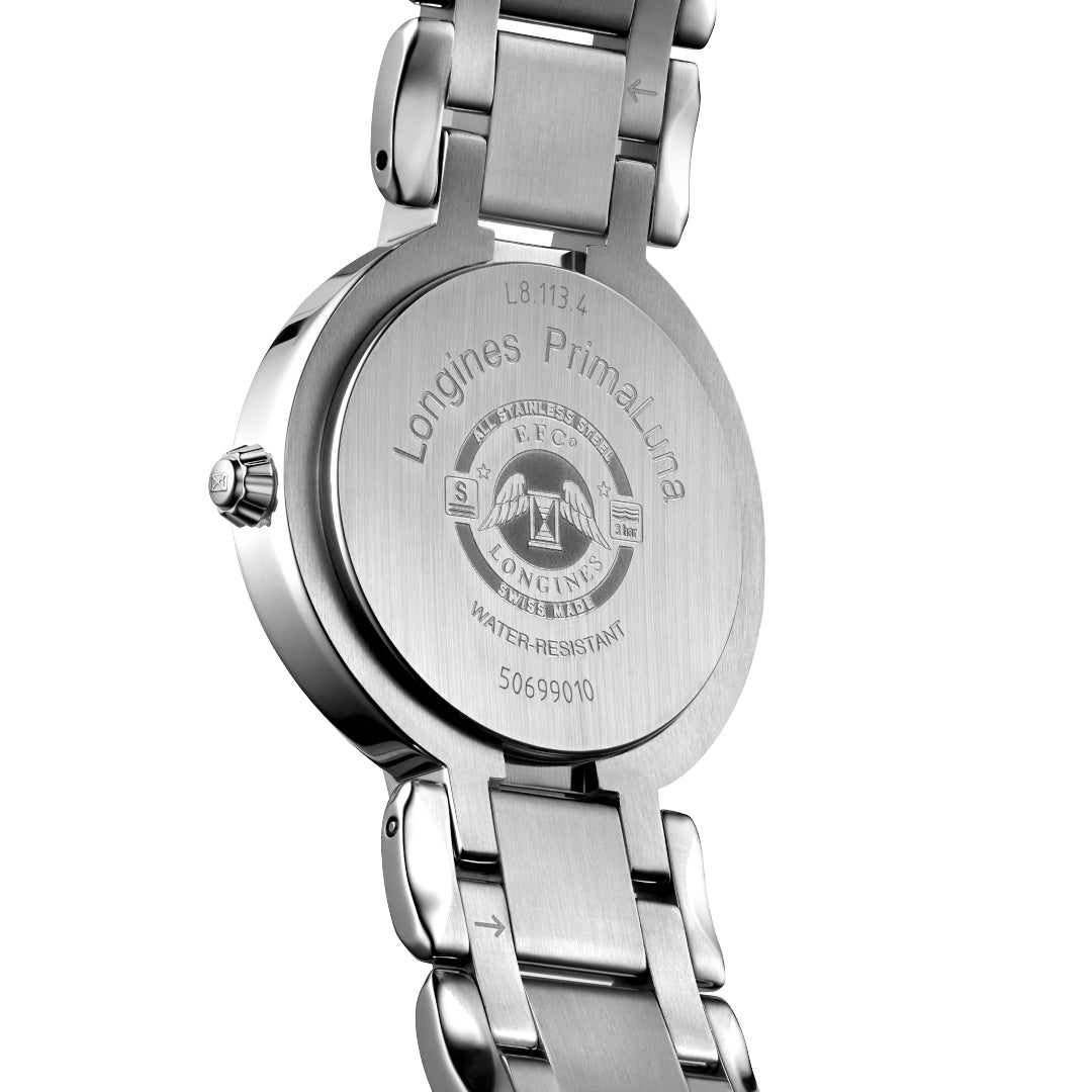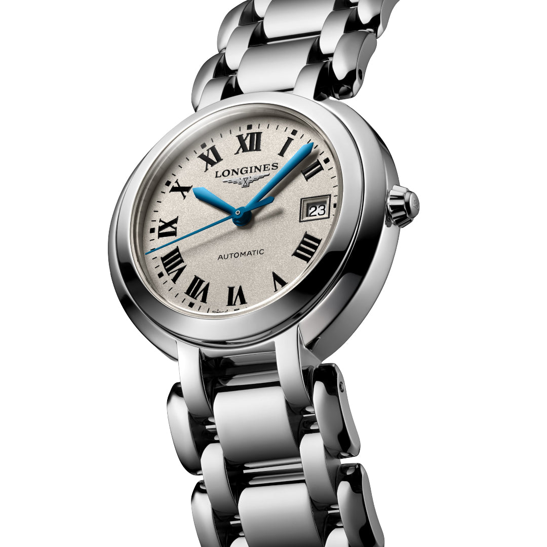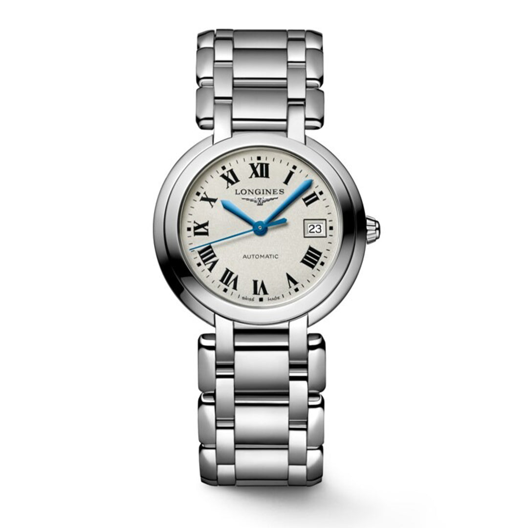 The longines primaluna is a 30 mm automatic watch with a silver dial and stainless steel bracelet. It features a date display, 45-hour power reserve, scratch-resistant sapphire crystal, and 3 bar water resistance.