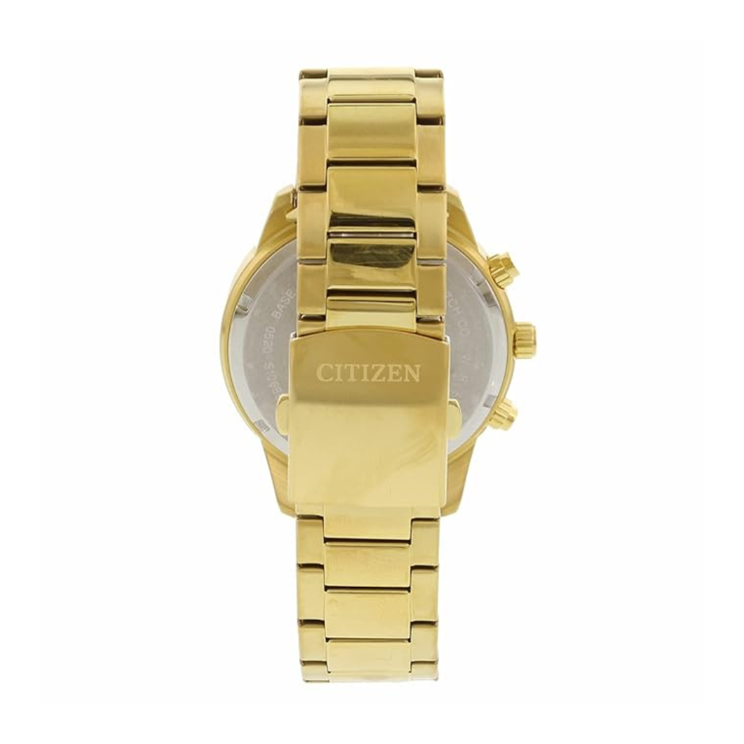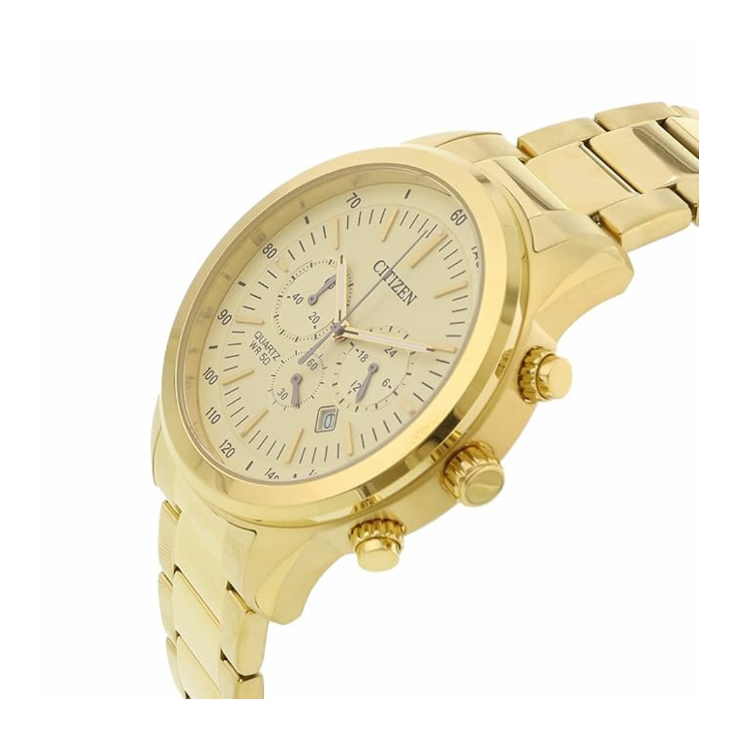 - Make a bold statement with this Citizen Chronograph, designed for men who appreciate refined style and precision performance. Featuring a stainless steel gold-tone case and bracelet, this timepiece combines luxury with durability.