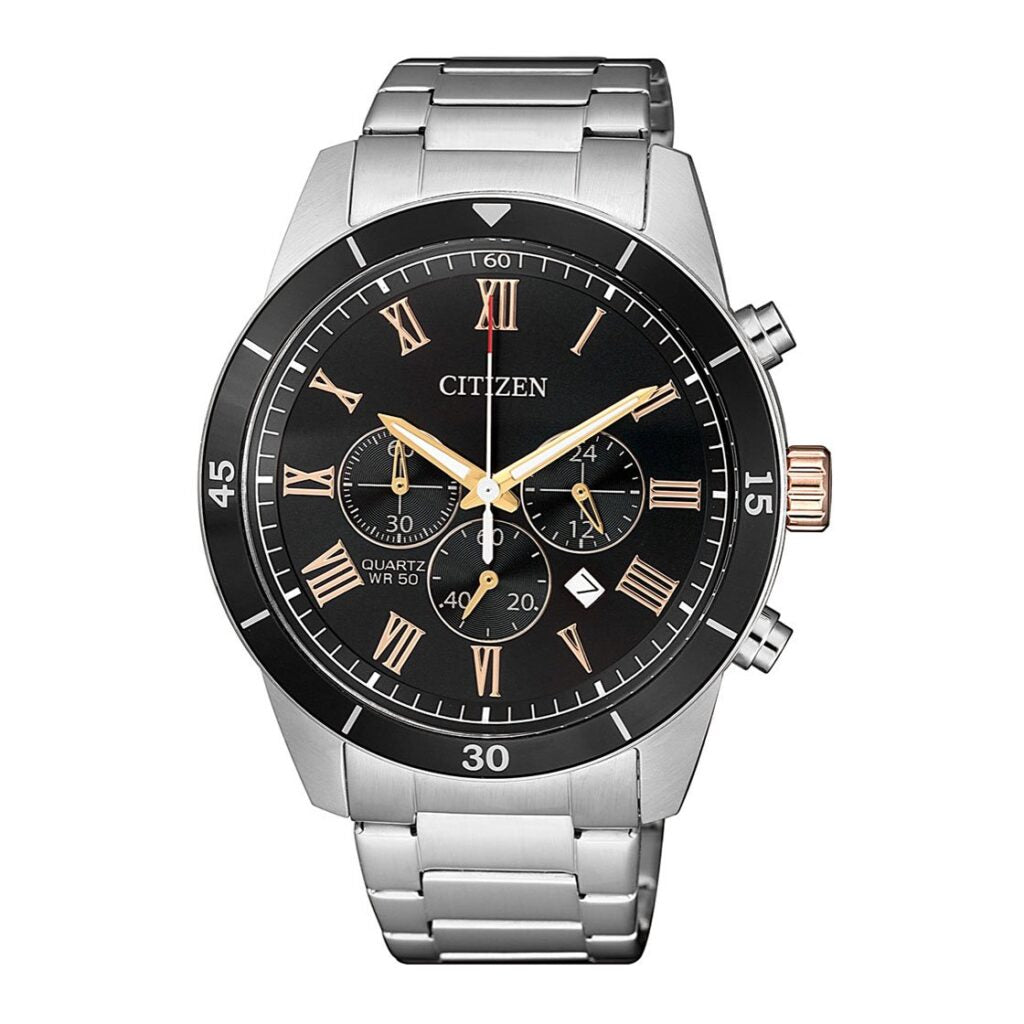 - A refined balance of style and performance, this Citizen Chronograph Quartz Men’s Watch is designed for the modern gentleman. The 41mm stainless steel case and bracelet give a sleek, timeless look, while the crystal glass ensures lasting clarity and protection.