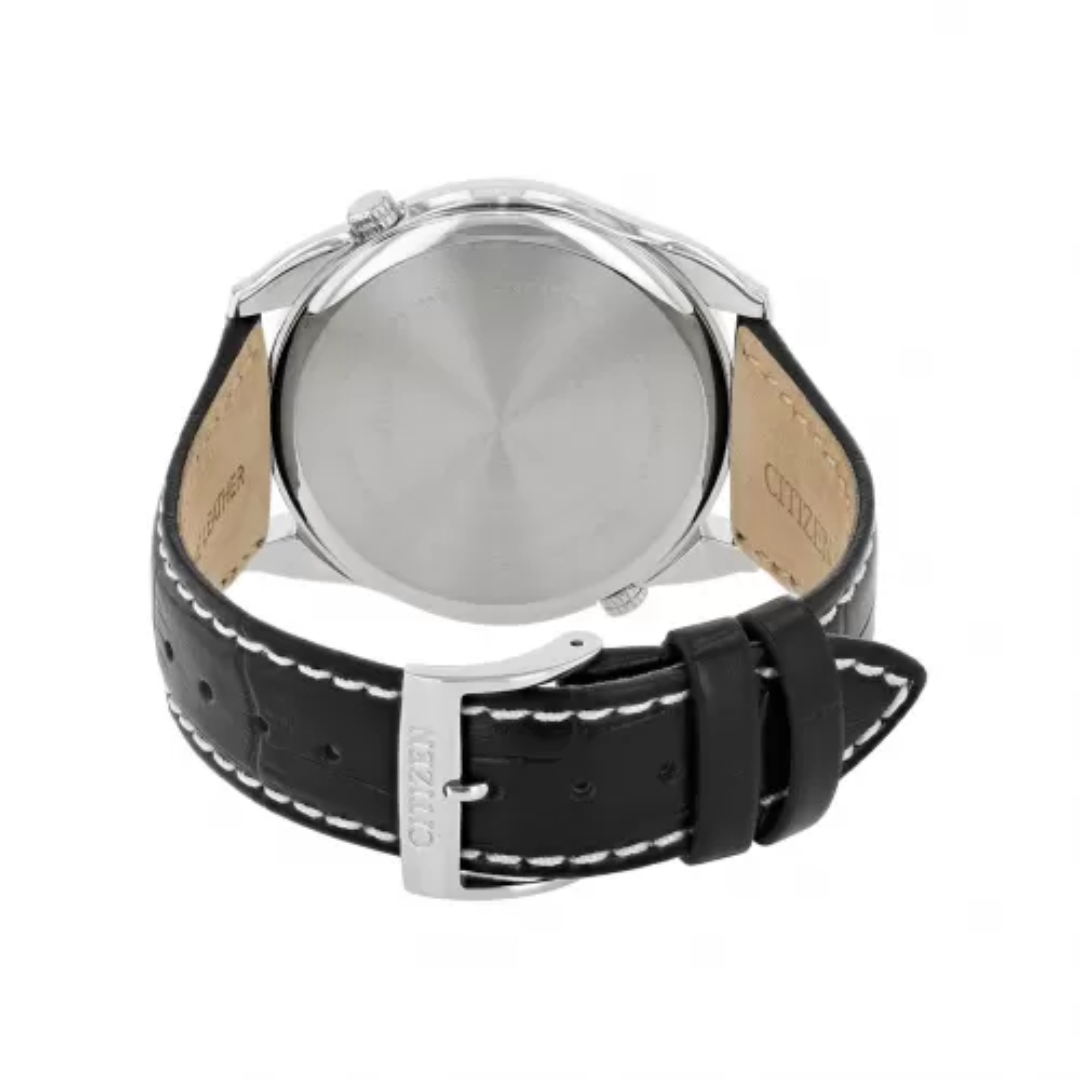 - Elevate your everyday style with the Citizen Quartz Dual Time Watch, a refined blend of elegance and practicality. Featuring a bold 44mm stainless steel case paired with a sleek black dial and genuine leather strap, this timepiece embodies timeless sophistication.