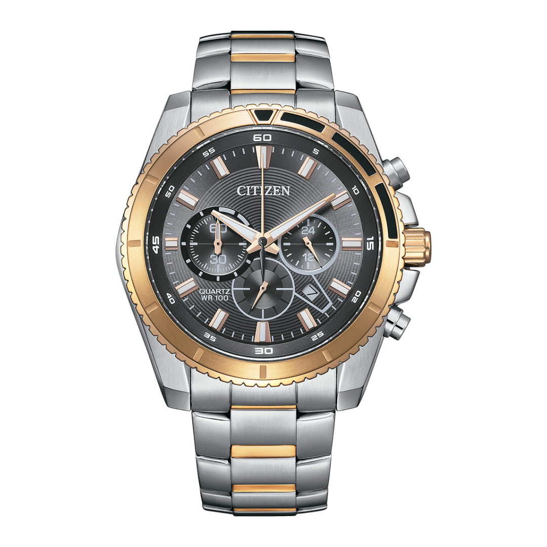 The Citizen Quartz Men’s Sports Chronograph features a precise Caliber 0520 movement with a 1/1 second chronograph (60-minute timing), 24-hour display, and date function. Crafted from durable stainless steel, it comes with a matching bracelet and a sleek grey dial protected by crystal glass. Powered by Citizen’s reliable Japanese Quartz technology, this sporty watch offers 10 bar water resistance and a bold 44 mm case design — perfect for everyday style and performance.