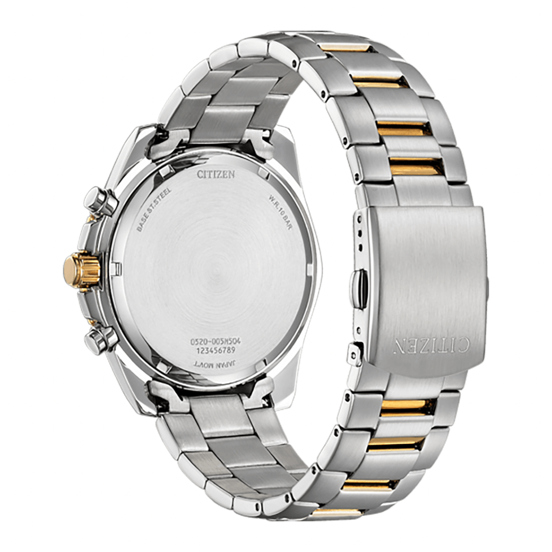 The Citizen Quartz Men’s Sports Chronograph features a 1/1 second chronograph with 60-minute timing, 24-hour display, and date function. Designed with a stainless steel case and bracelet, it showcases a refined champagne dial that stands out with elegance. Powered by Citizen’s high-precision Japanese Quartz movement, this timepiece runs on Caliber 0520 for reliable performance and lasting style.