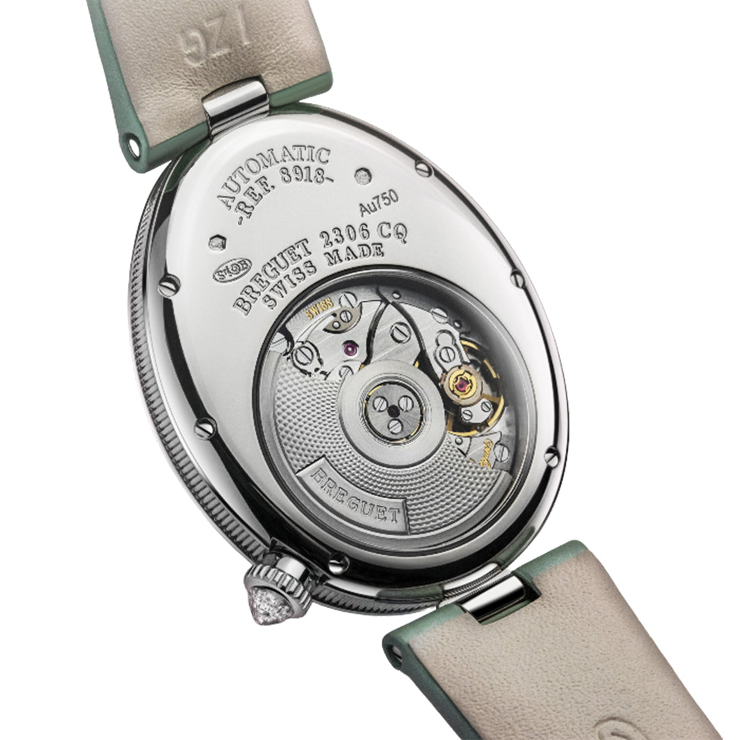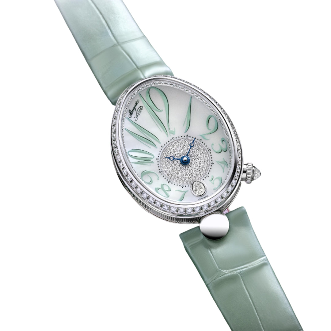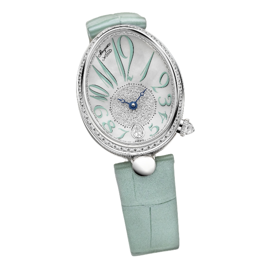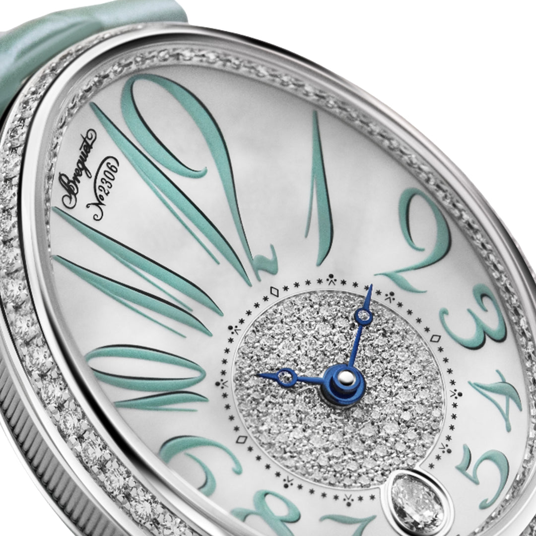 This elegant breguet timepiece features large breguet numerals, open-tipped hands, and a pear-cut stone at 6 o’clock with a ball-link strap attachment. Crafted in 18k white gold (28.5 mm x 10.1 mm), it is adorned with diamond-set bezel, crown, and flange. Powered by the automatic caliber 537/3, it offers a 45-hour power reserve with a sapphire case back for refined appeal.