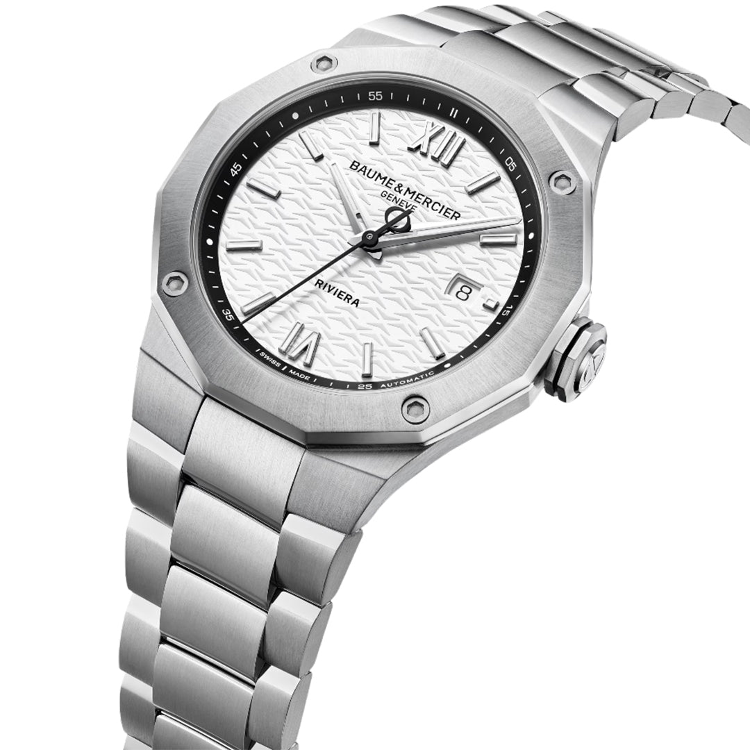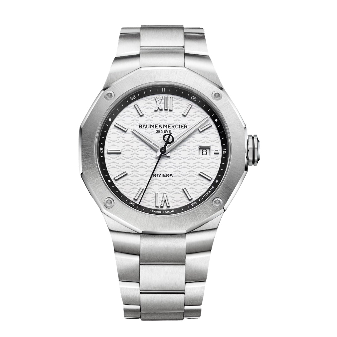 The Riviera is a 42 mm automatic watch with a white wave-patterned dial, black bezel, and riveted roman numerals with super-luminova hands. It features a date display, sw200 movement with 38-hour power reserve, 10 atm water resistance, and an interchangeable stainless-steel bracelet.