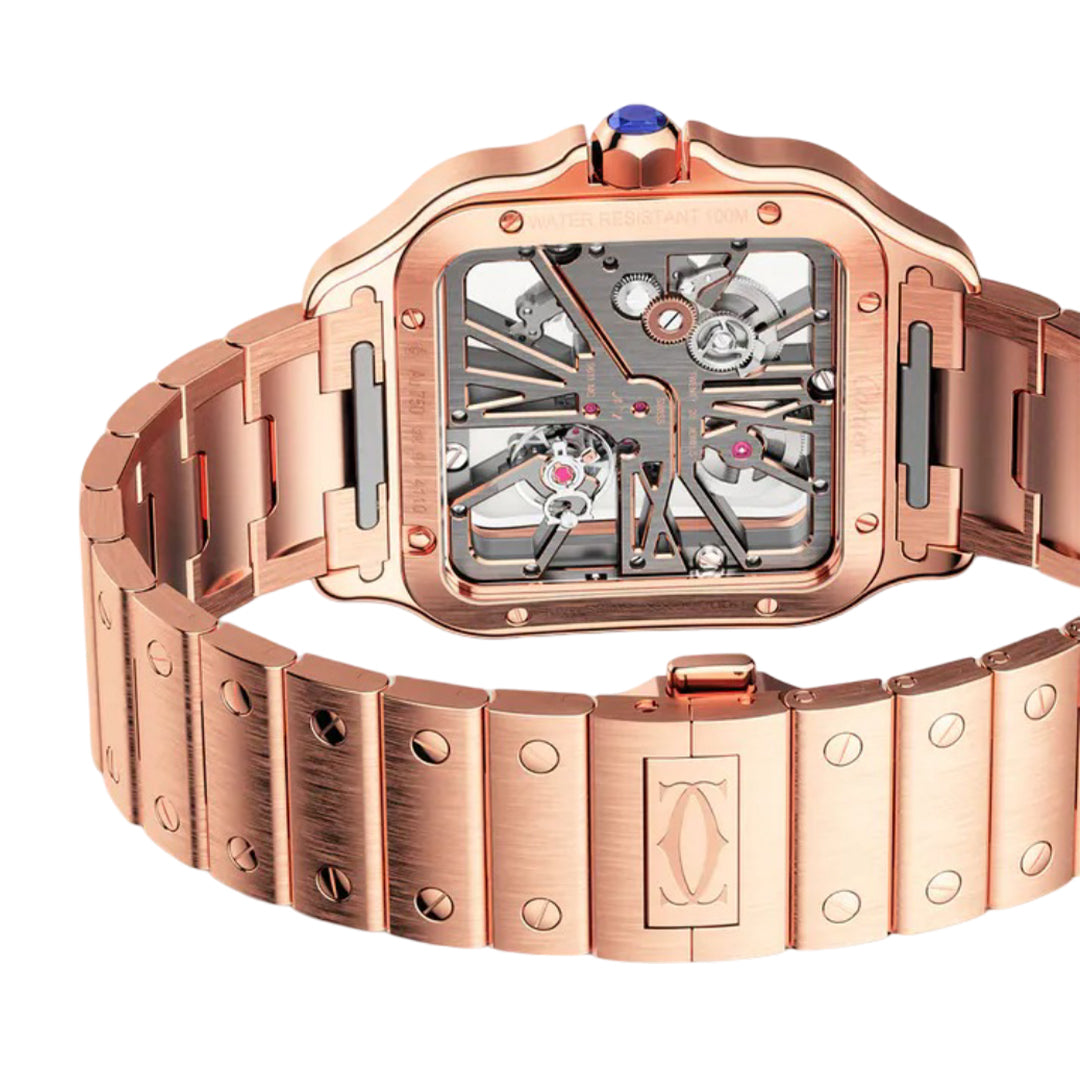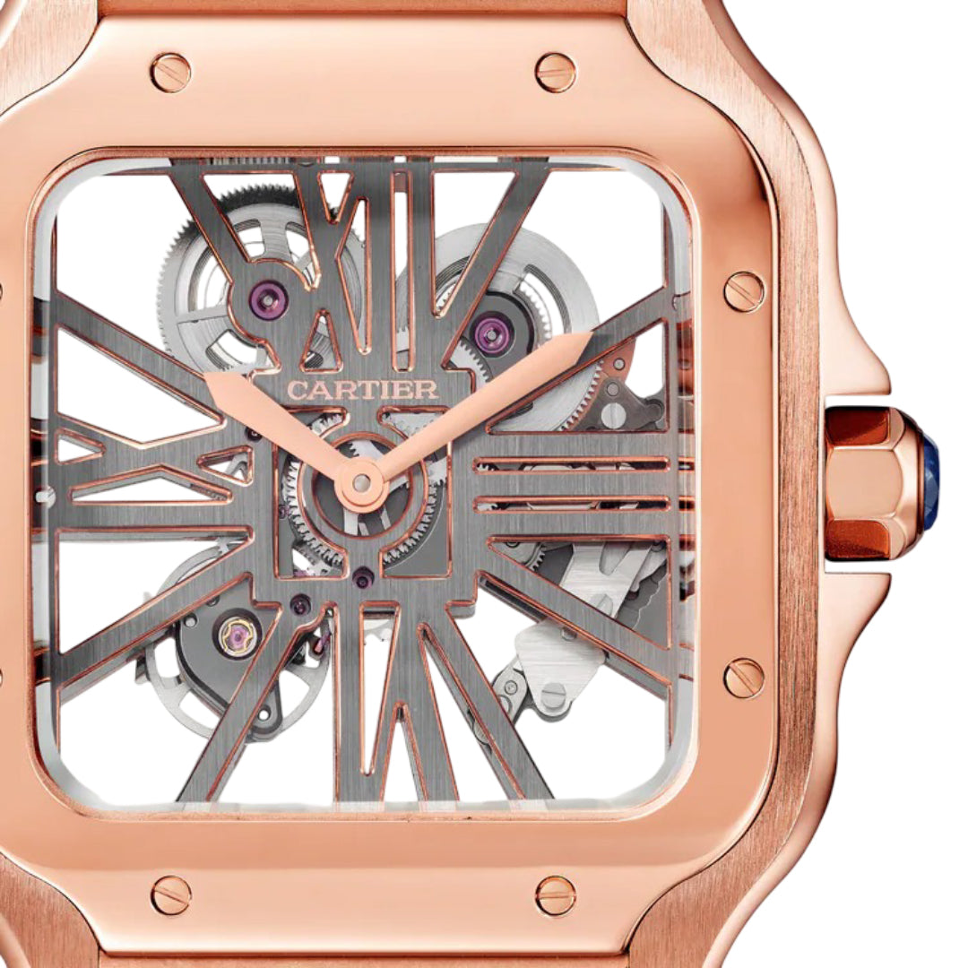 The santos de cartier skeleton pays tribute to the pioneering spirit of aviation, featuring the iconic square case with exposed screws and skeletonized bridges shaped as roman numerals. Bold, innovative, and unmistakably cartier, it reimagines the historic 1904 design with contemporary horological artistry.