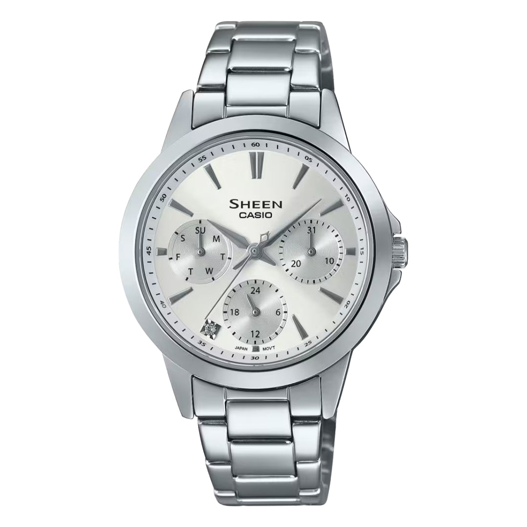 The casio she-3516d-7a blends elegance with function, featuring a multi-dial analog design and a crystal accent at 7 o’clock. Built with sapphire glass and 50m water resistance, it offers durability and sophistication. Its stainless-steel case and band make it a versatile accessory for any occasion.