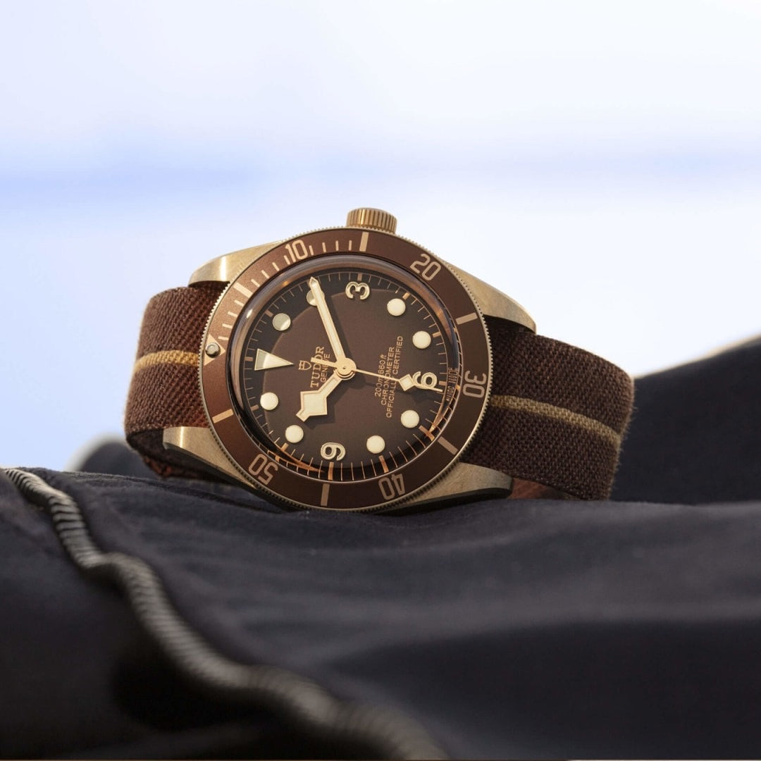 - This 39mm TUDOR timepiece features a satin-brushed bronze case that naturally evolves in colour over time, paired with a unidirectional rotating bronze bezel with a matte brown-bronze aluminium insert. The gradient brown-bronze domed dial includes applied hour markers and Arabic numerals at 3, 6, and 9 o’clock, protected by a domed sapphire crystal.