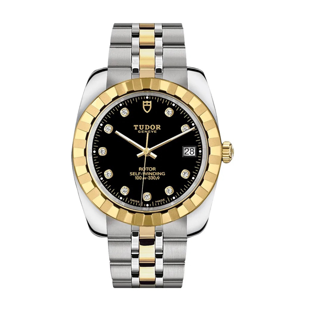- This stylish 38mm timepiece features a black dial set with 10 sparkling diamonds and a yellow gold bezel for a refined look.