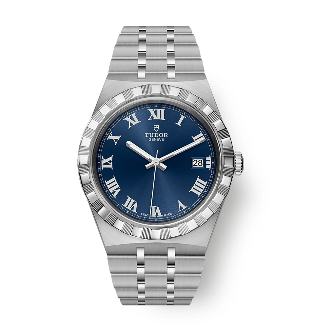 - It features a polished and satin-finished stainless steel case (10.4mm thick, 10mm lug width) and a notched steel bezel with alternating cut grooves and polished details. The blue sunray-finish dial includes applied Roman numerals and a date window at 3 o’clock, protected by a scratch-resistant sapphire crystal.