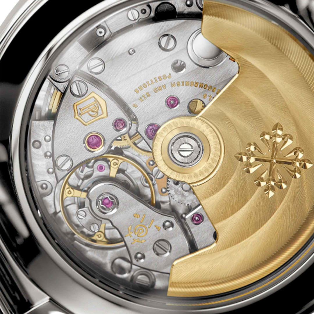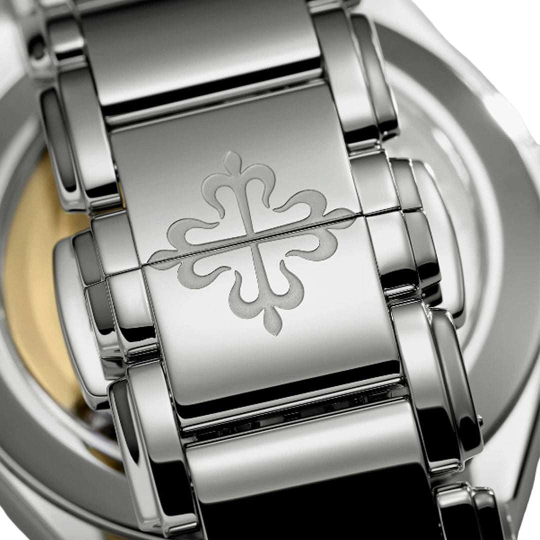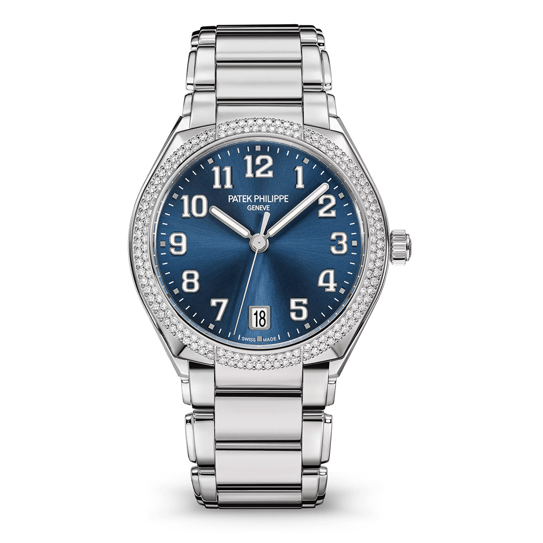 The Patek Philippe Twenty4 7300/1200A-001 is a modern ladies’ timepiece in steel, featuring a 36 mm case with a diamond-set bezel (160 diamonds, 0.81 ct). Its sunburst blue dial shines with white gold numerals and luminescent baton-style hands, paired with a matching steel bracelet. Powered by the self-winding Caliber 26-330 S C, it offers date, sweep seconds, and a 35–45 hour power reserve, certified by the Patek Philippe Seal.