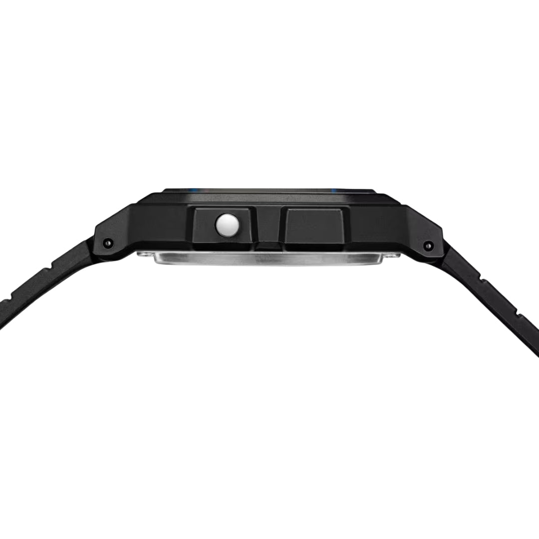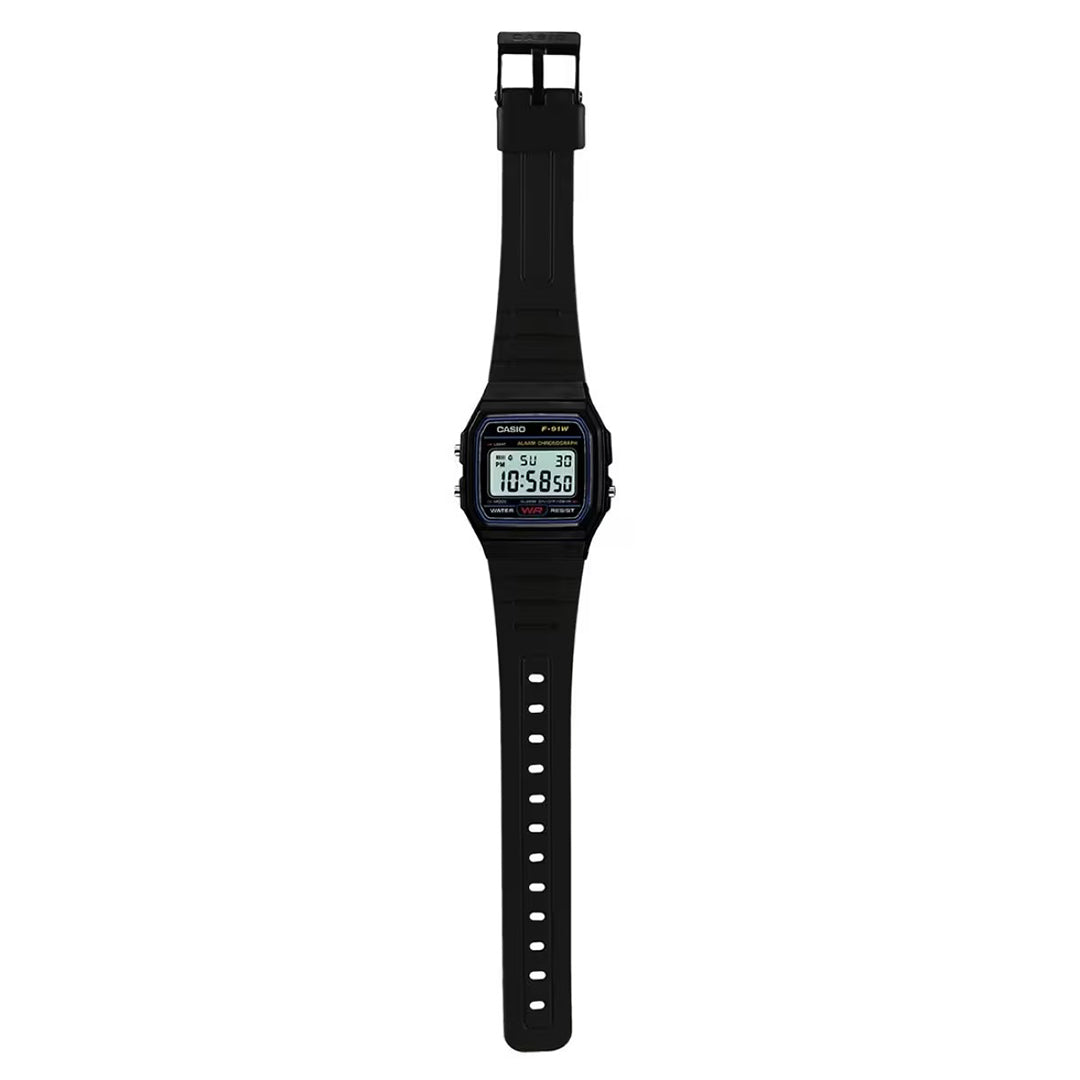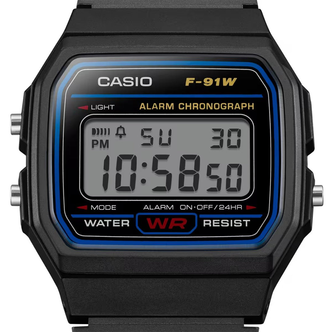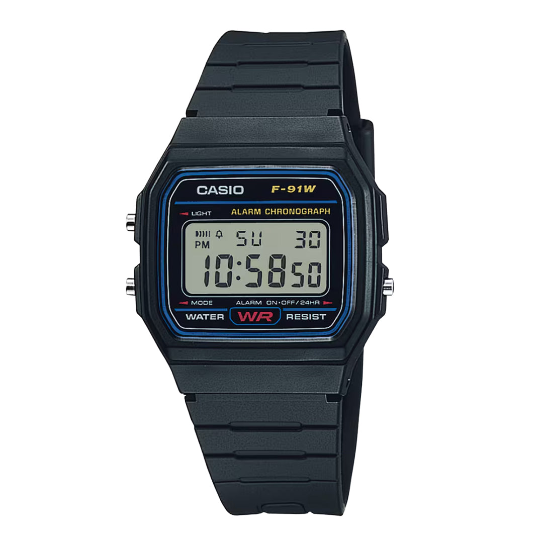 The Casio f-91w-1 is a lightweight, durable classic with a resin case and band, weighing only 21 g. It features a 1/100-second stopwatch, daily alarm, auto-calendar, and led light. With 7-year battery life
